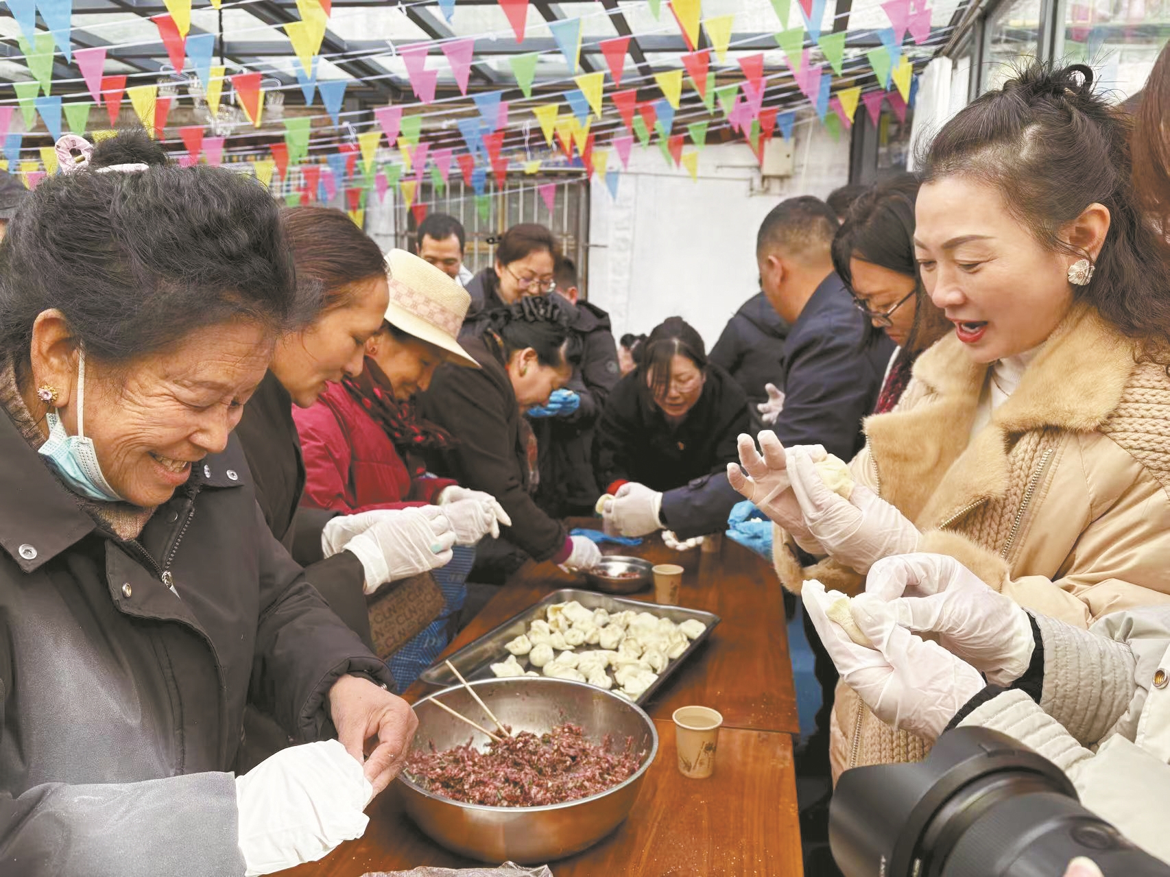 当天上午,党员们和老人们围在一起,共同调馅、包饺子。在欢声笑语中,一盘盘饺子下锅,热气腾腾的饺子传递着浓浓的关怀。老人们围坐用餐,脸上洋溢着幸福笑容。