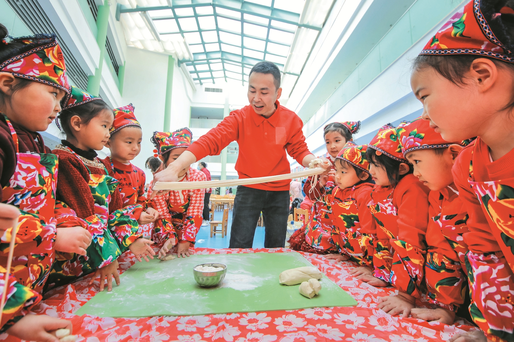 ?这是二月二十八日,在山东省青岛市李沧区衡水路幼儿园开展的“二月二,龙抬头”民俗活动中,面点师为孩子们展示制作龙须面。(新华社发)