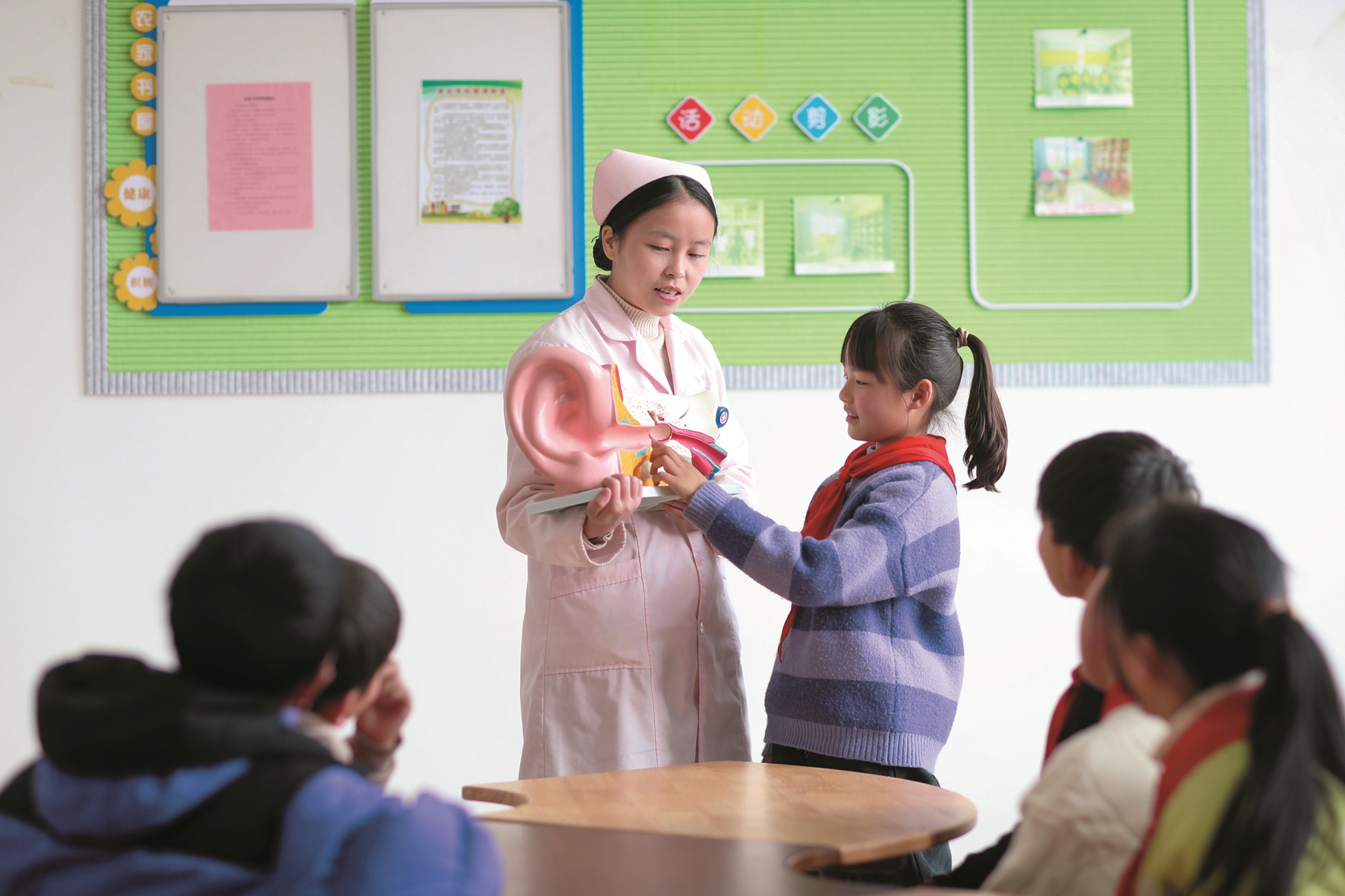 图②为3月2日,医务人员在江苏省兴化市昌荣镇陈唐村新时代文明实践站给学生讲解耳朵的构造及护耳知识。