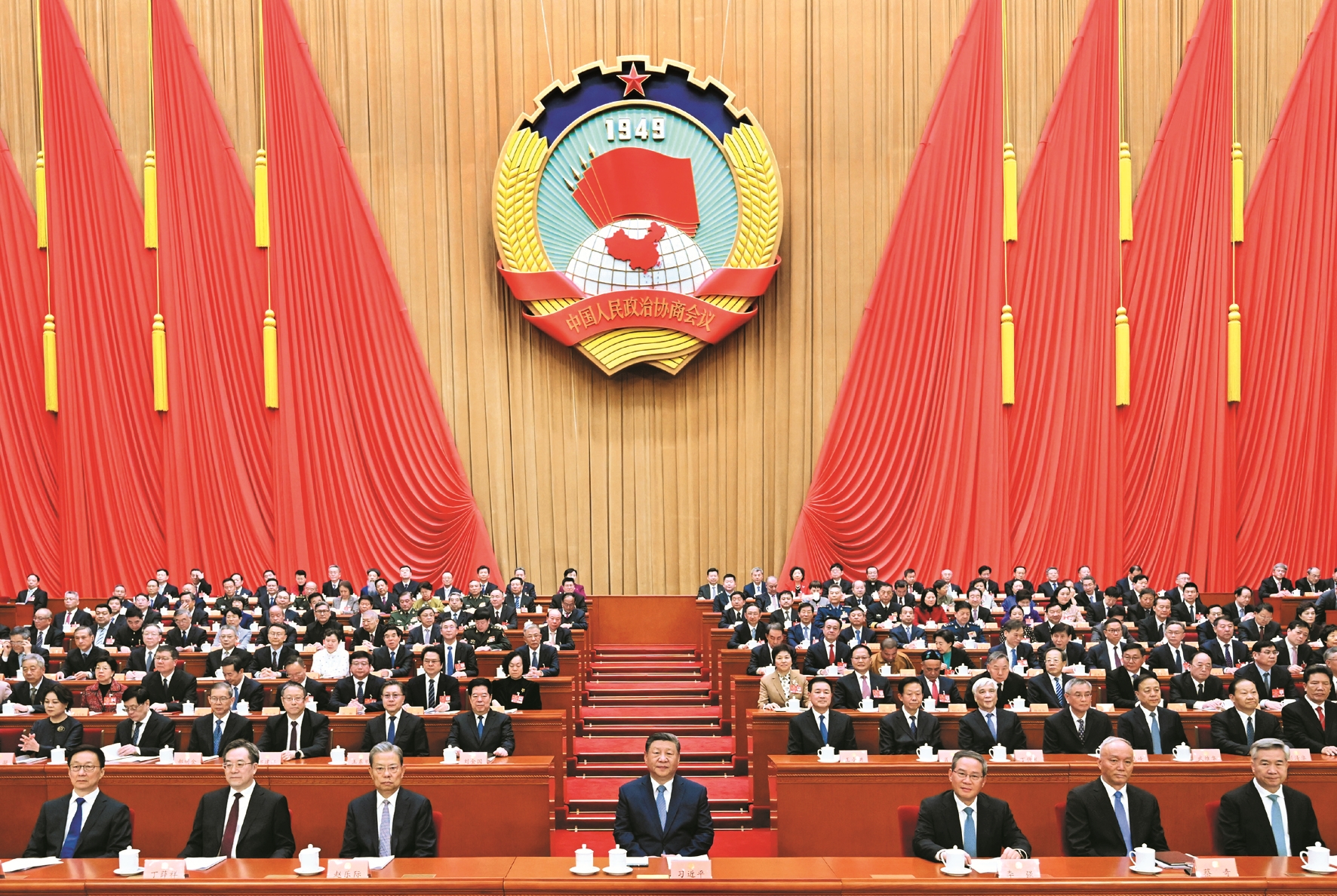 3月4日下午,中国人民政治协商会议第十四届全国委员会第三次会议在北京人民大会堂开幕。这是习近平、李强、赵乐际、蔡奇、丁薛祥、李希、韩正在主席台就座。 新华社记者 谢环驰摄
