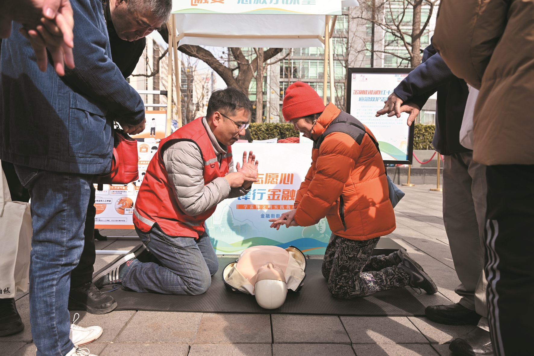 图为志愿者向市民演示如何进行心肺复苏。