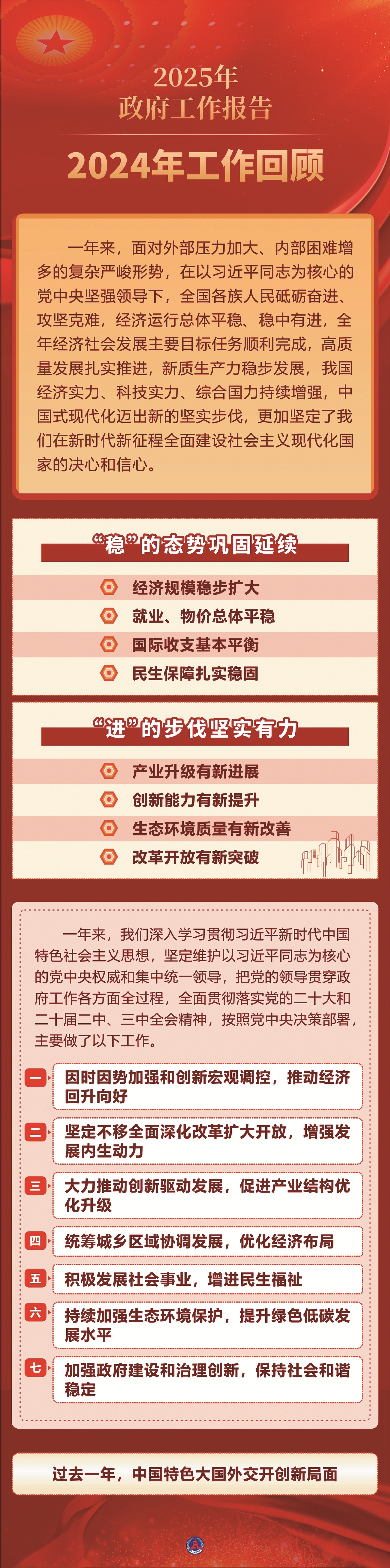 国务院总理李强5日在政府工作报告中指出,过去一年,我国发展历程很不平凡。党的二十届三中全会胜利召开,对进一步全面深化改革、推进中国式现代化作出部署。我们隆重庆祝中华人民共和国成立75周年,极大激发了全国各族人民的爱国热情和奋斗精神。一年来,面对外部压力加大、内部困难增多的复杂严峻形势,在以习近平同志为核心的党中央坚强领导下,全国各族人民砥砺奋进、攻坚克难,经济运行总体平稳、稳中有进,全年经济社会发展主要目标任务顺利完成,高质量发展扎实推进,新质生产力稳步发展,我国经济实力、科技实力、综合国力持续增强,中国式现代化迈出新的坚实步伐,更加坚定了我们在新时代新征程全面建设社会主义现代化国家的决心和信心。