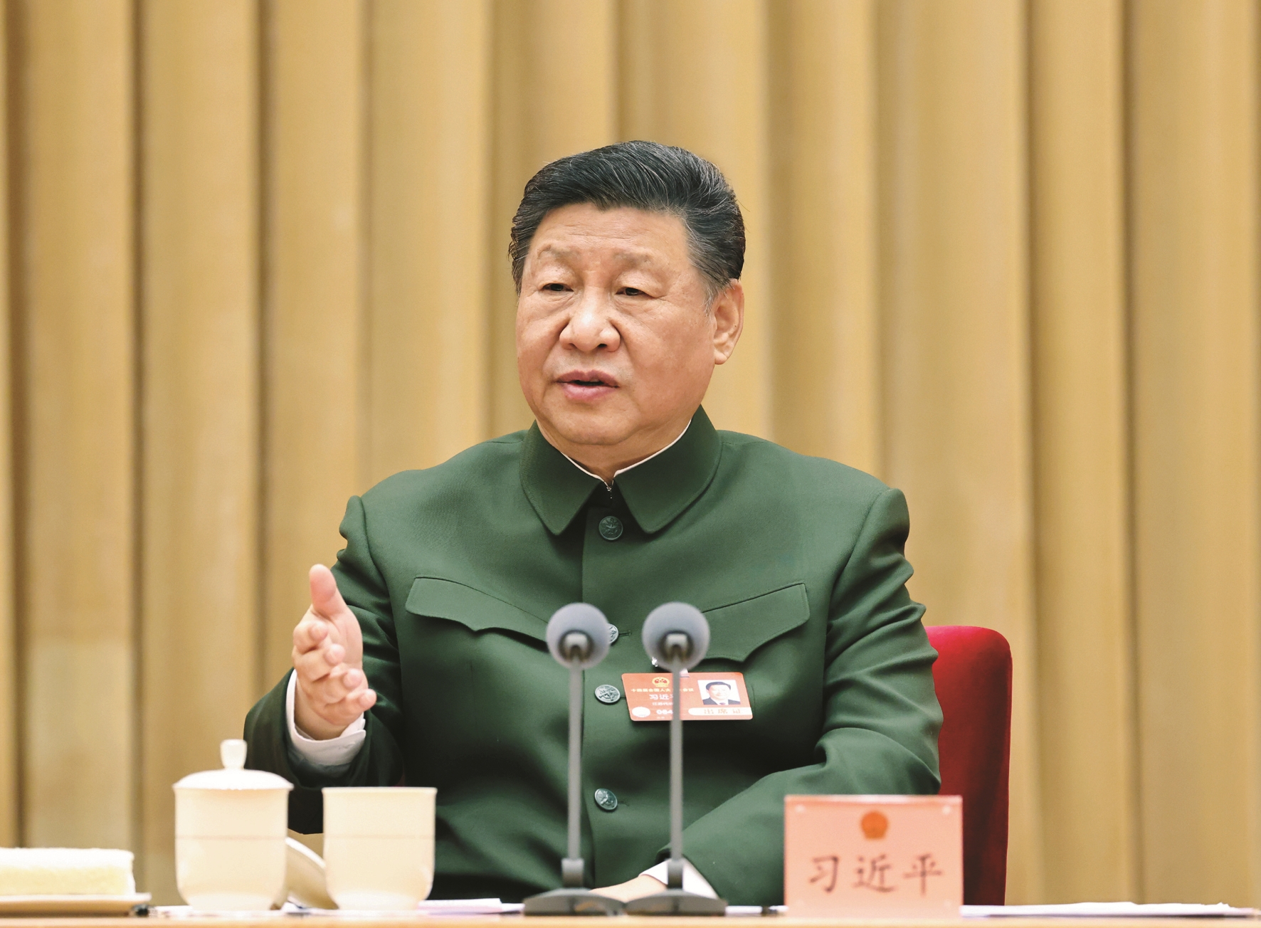 3月7日下午,中共中央总书记、国家主席、中央军委主席习近平出席十四届全国人大三次会议解放军和武警部队代表团全体会议并发表重要讲话。新华社记者 李 刚摄