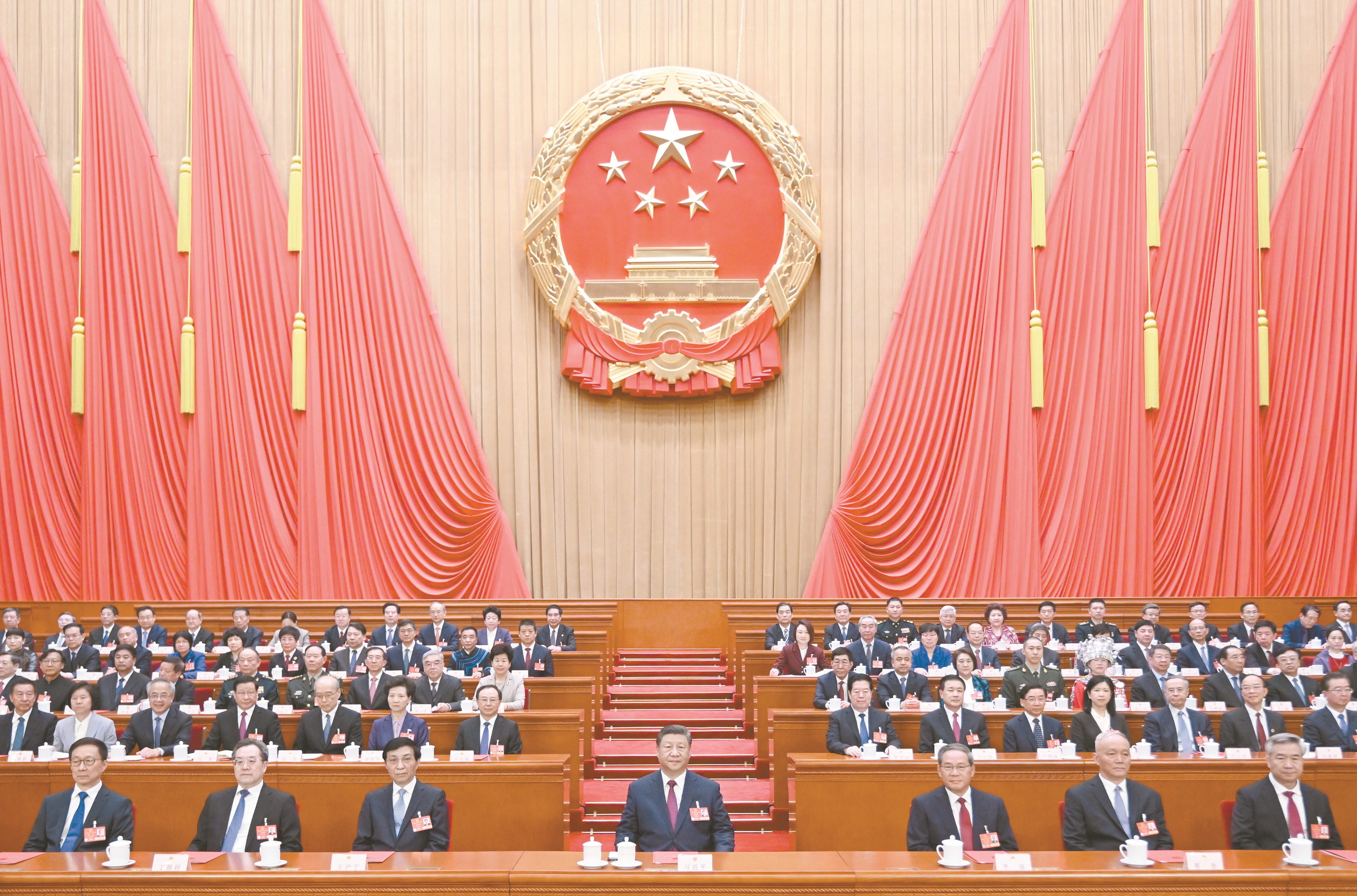 3月11日下午,第十四届全国人民代表大会第三次会议在北京人民大会堂闭幕。党和国家领导人习近平、李强、王沪宁、蔡奇、丁薛祥、李希、韩正等在主席台就座。 新华社记者 李学仁摄