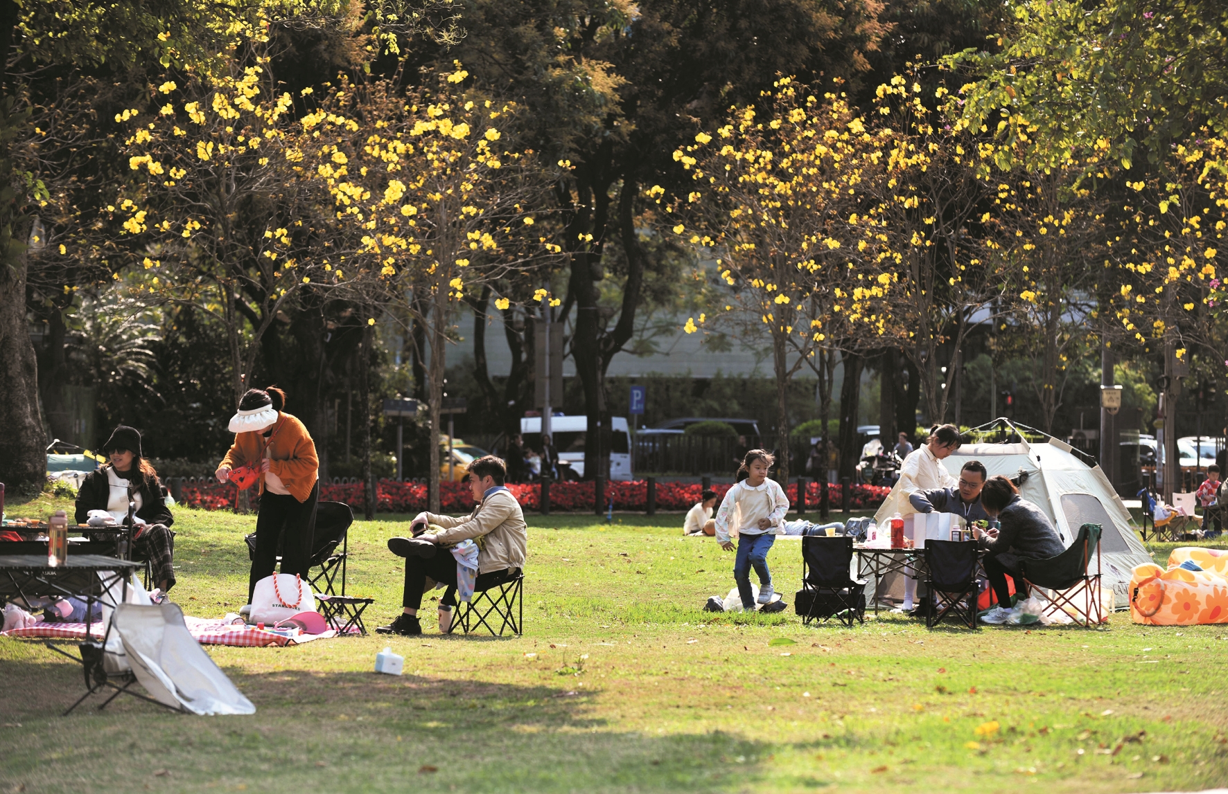 图为3月16日,市民游客在广州二沙岛发展公园露营游玩。