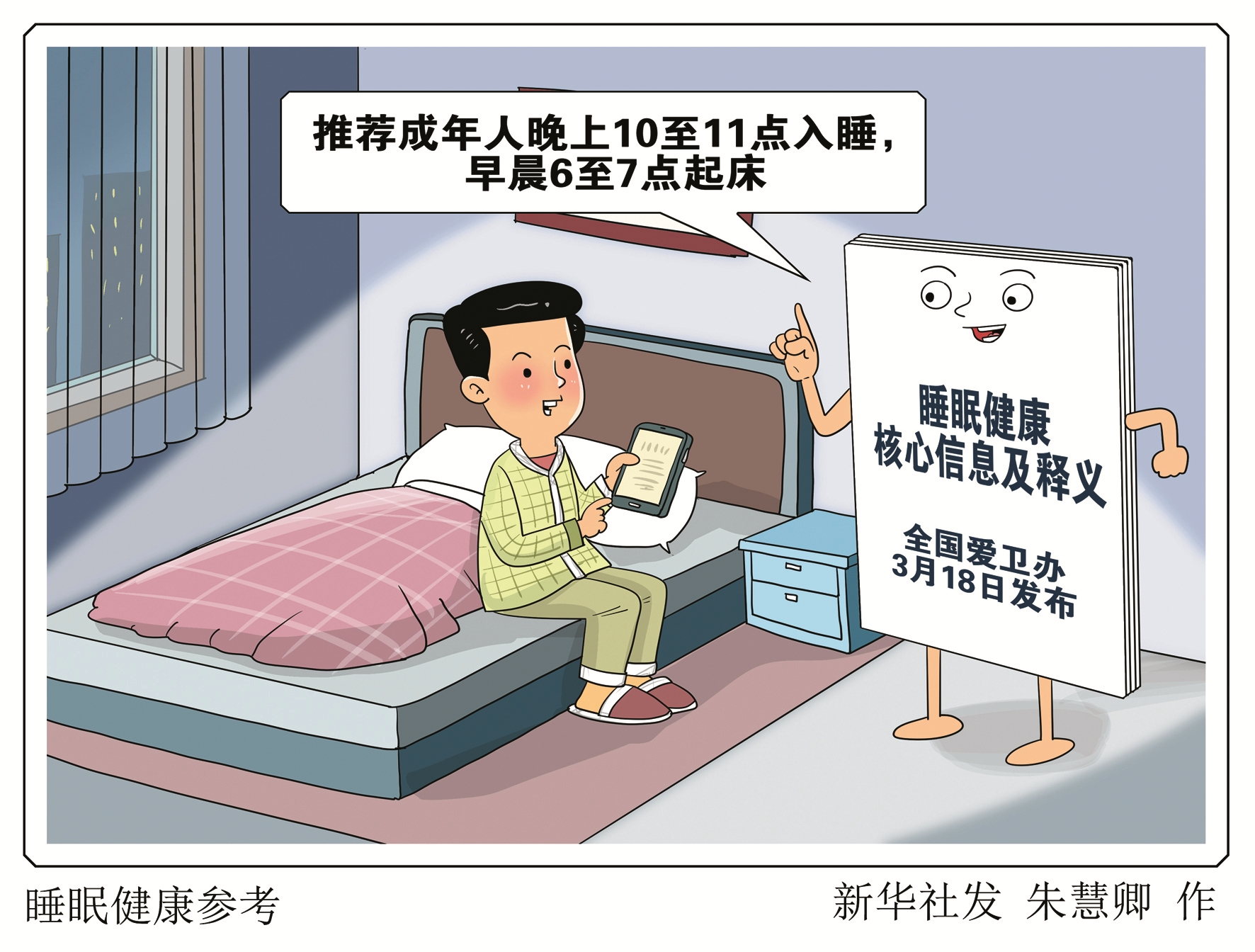 新华社北京3月18日电(记者董瑞丰、李恒)全国爱卫办18日发布《睡眠健康核心信息及释义》,推荐成年人晚上10至11点入睡,早晨6至7点起床,其中老年人可早晨5至6点起床。