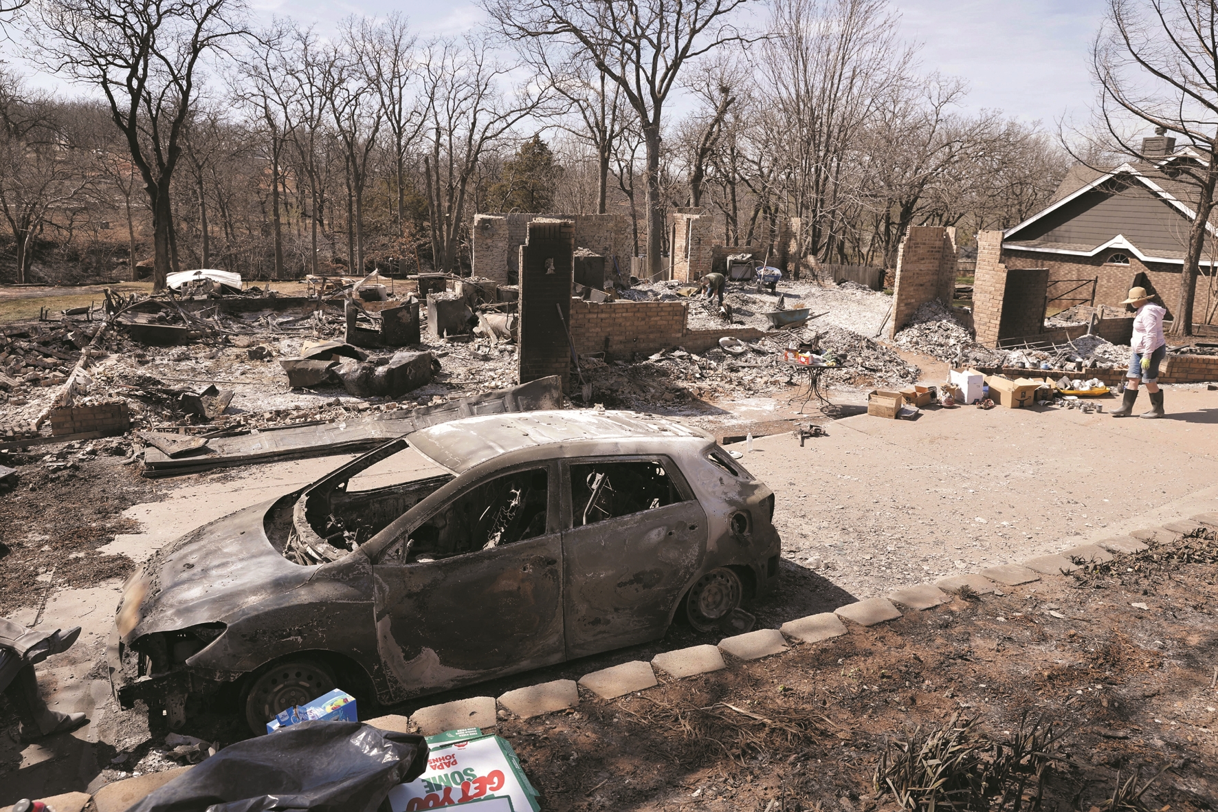 图为3月17日,在美国俄克拉何马州斯蒂尔沃特,人们查看被野火烧毁的房屋和车辆。