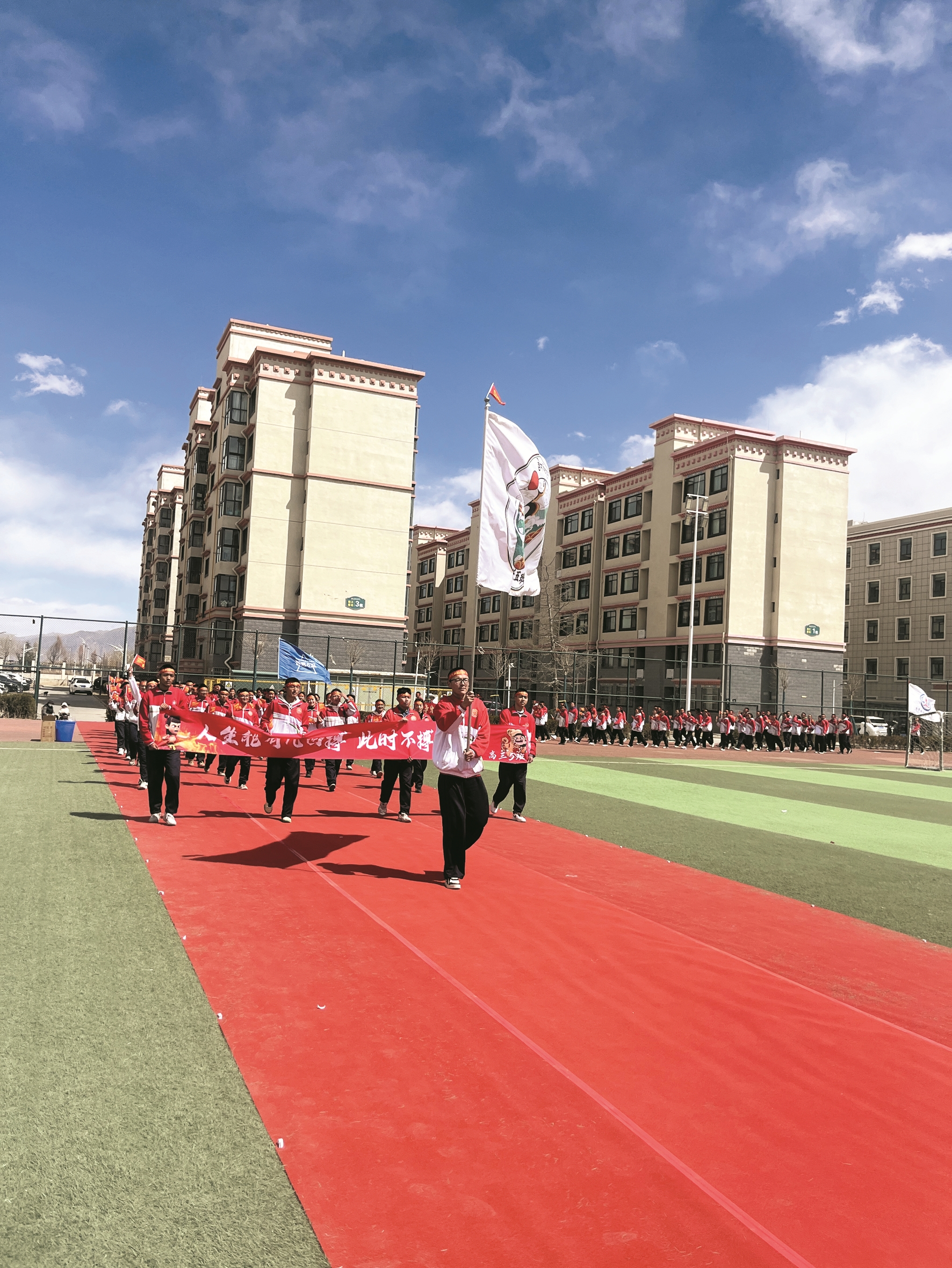 拉萨融媒讯(记者王泽江)3月18日,拉萨市北京中学700余名高三学子身着整齐的校服,列队站立。操场中央,一条巨型横幅在高原湛蓝的天空下格外醒目,上面写着“八十日奋战铸辉煌,六月桂冠北高最强”。主席台两侧,家长和老师们手持哈达,翘首以盼,等待誓师队伍入场。