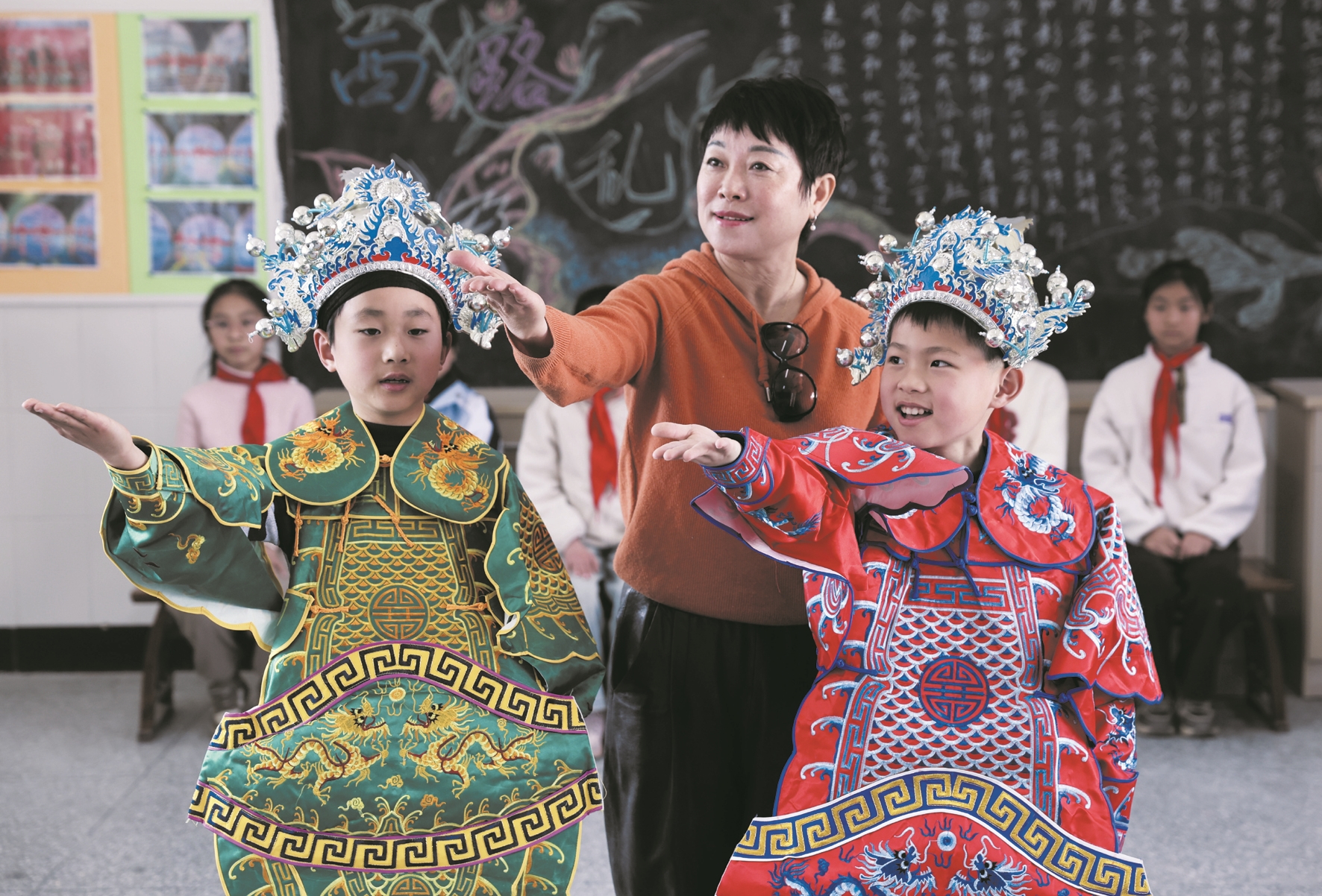 图为3月18日,东和乡小学西路乱弹传承特色班的学生在东和乡十里坪村文化特派员卓秋萍(中)的指导下学习西路乱弹的表演动作。