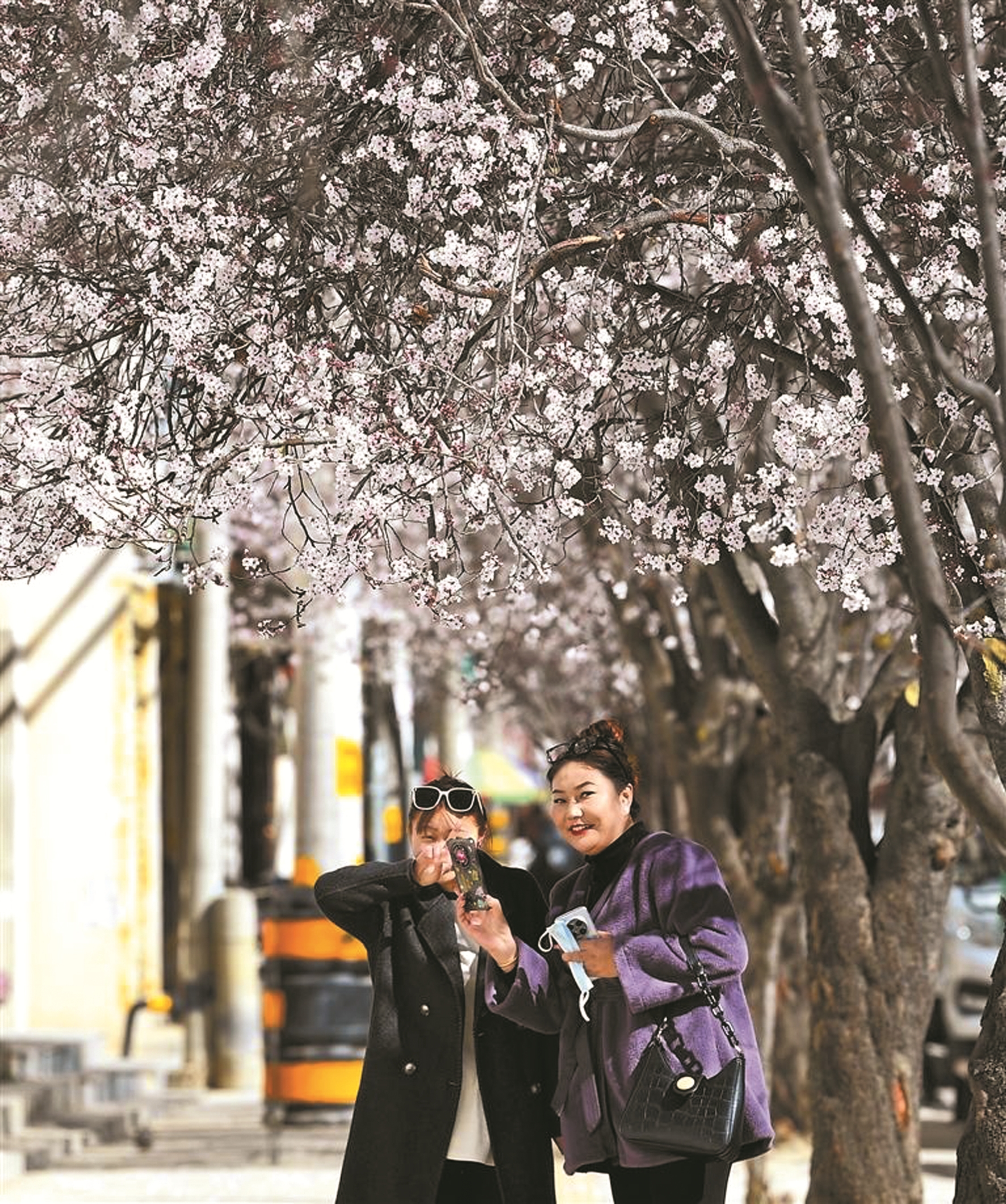 ←图为市民在拉萨市军民路盛开的桃花下拍照。西藏日报记者 洛 桑摄