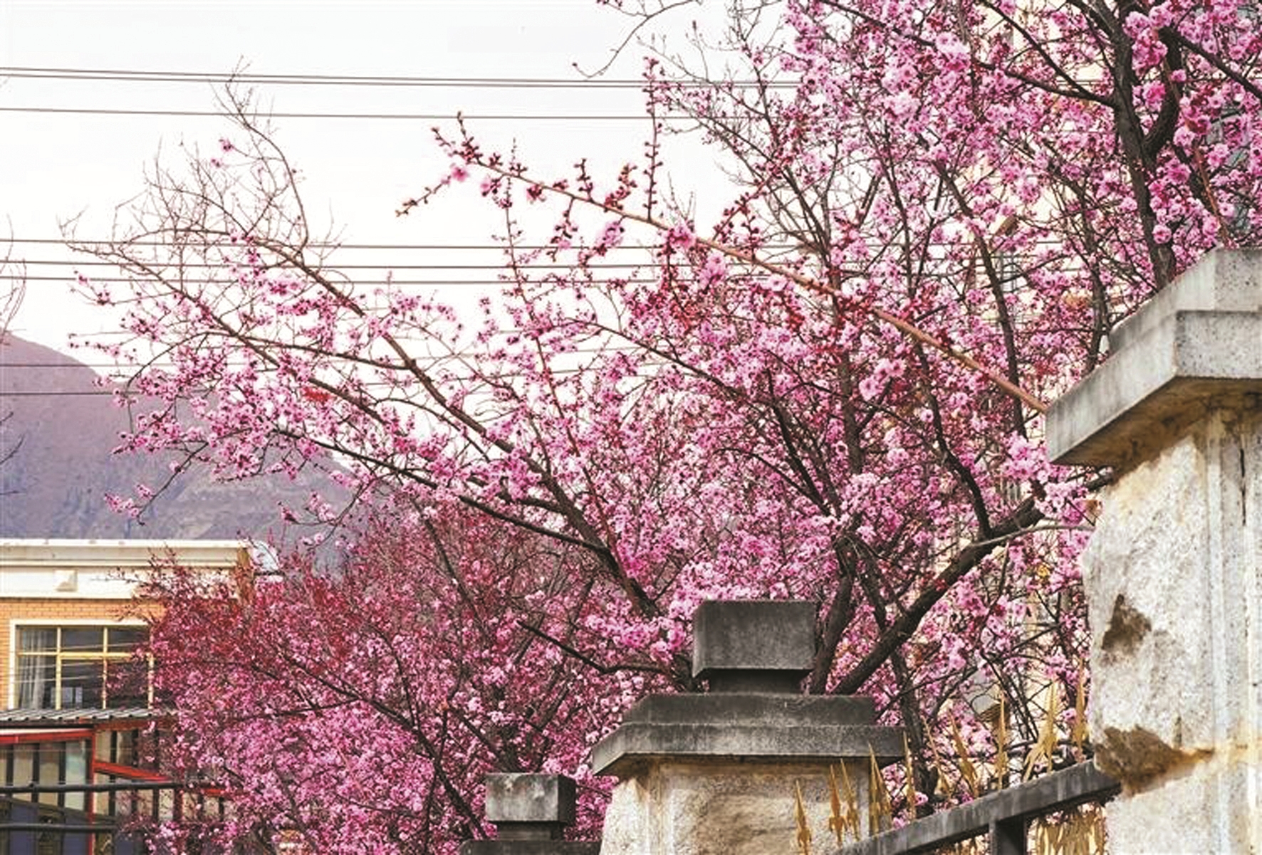 ↑图为拉萨市军民路上,粉色的花朵在春日暖阳中绚丽绽放。西藏日报记者 郑常容摄