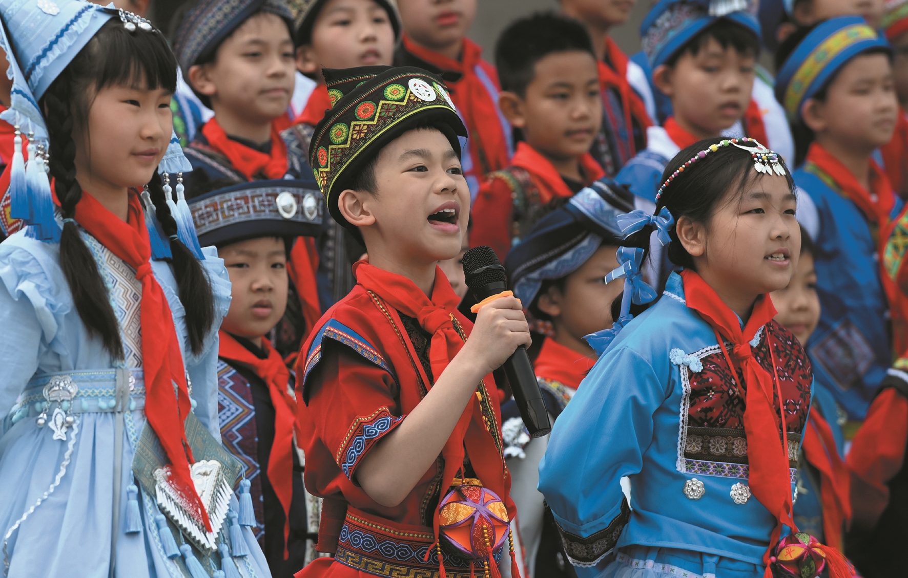 图为在广西南宁市滨湖路小学,学生在唱山歌。