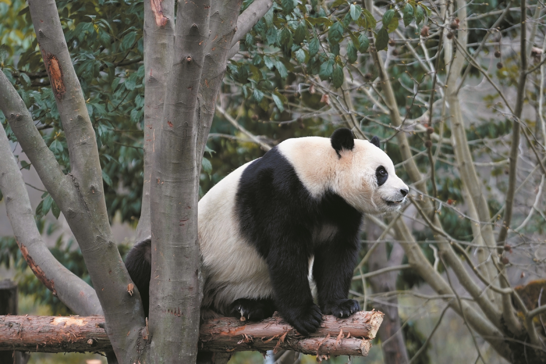 图为3月28日,在中国大熊猫保护研究中心卧龙神树坪基地,大熊猫“福宝”在树上玩耍。