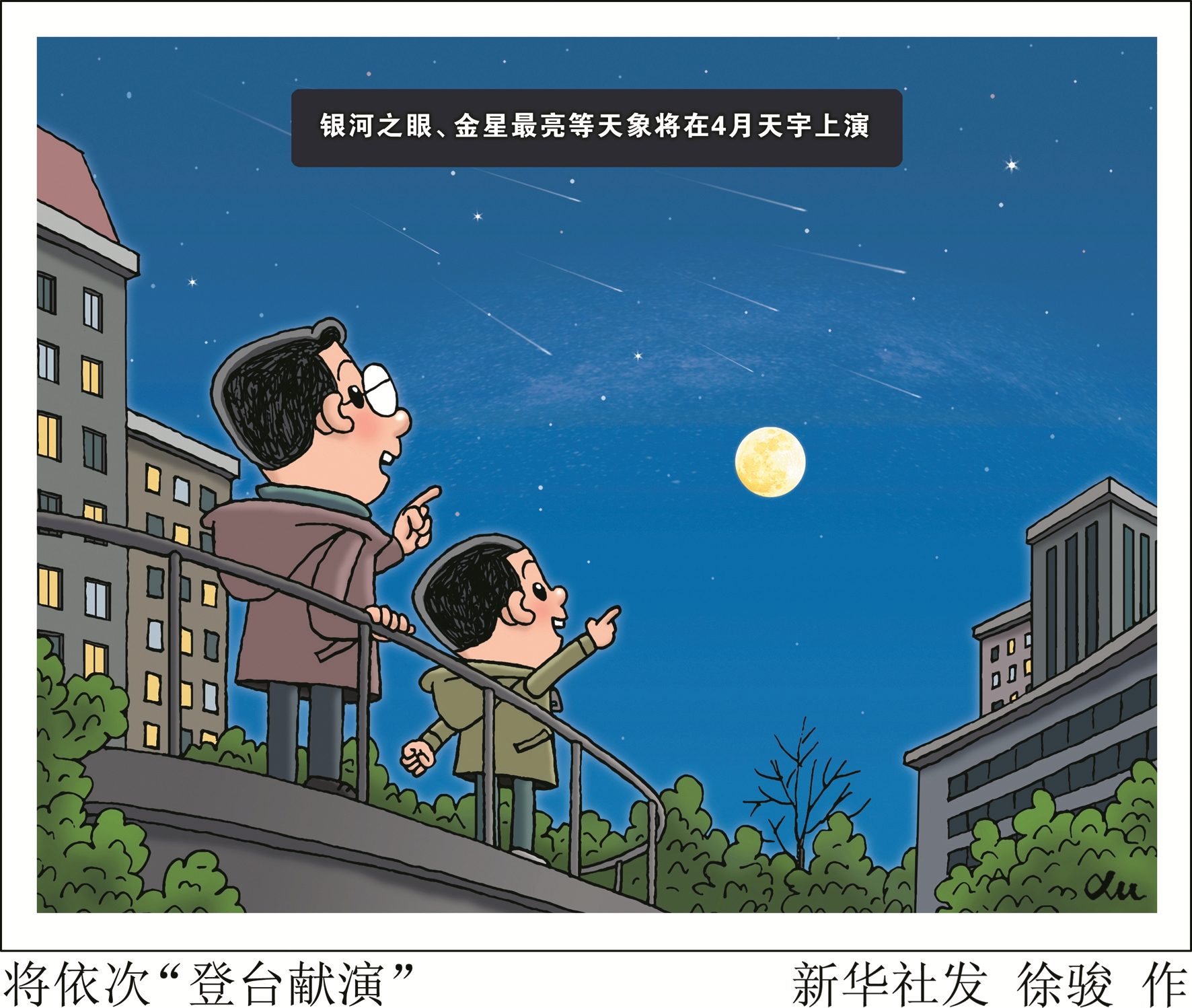 4月“星空舞台”的节目单新鲜出炉了:北斗七星、春季大三角、狮子座等春季星空的主角愈发显眼,昴星团和木星伴月、月掩金牛座β星、火星和北河三伴月、水星西大距、天琴座流星雨极大、金星和土星伴月、银河之眼、金星最亮等天象将依次“登台献演”。(新华社发)