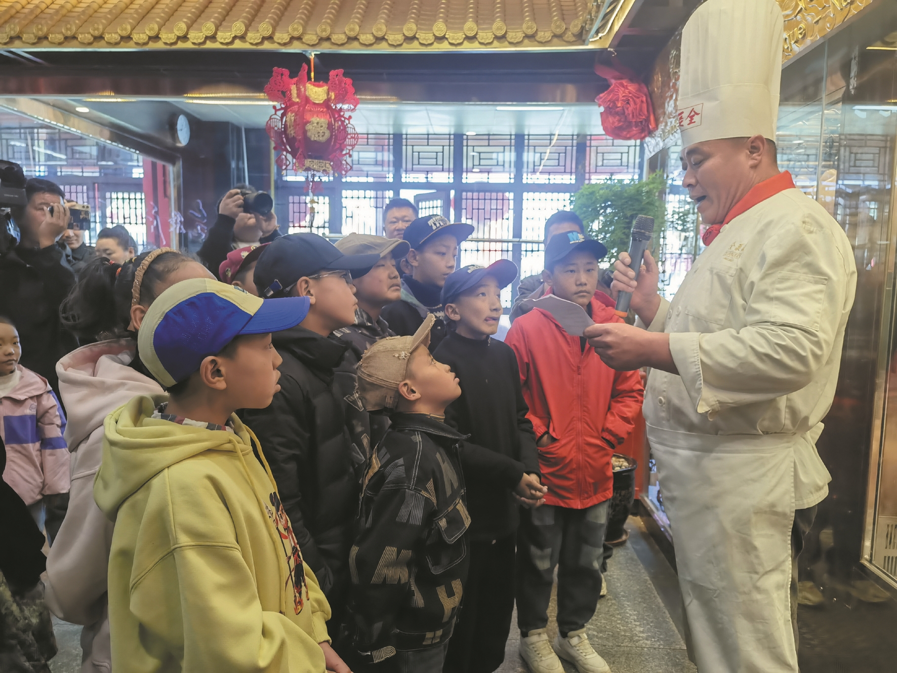 图为中国拉萨SOS儿童村的孩子们正在认真聆听全聚德挂炉烤鸭技艺传承人讲解京味饮食文化的深厚底蕴。拉萨融媒记者 杨 璐摄