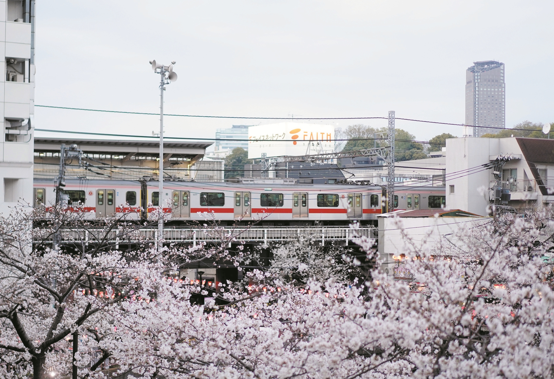 图为3月30日,一辆电车驶过日本首都东京目黑川畔盛开的樱花。