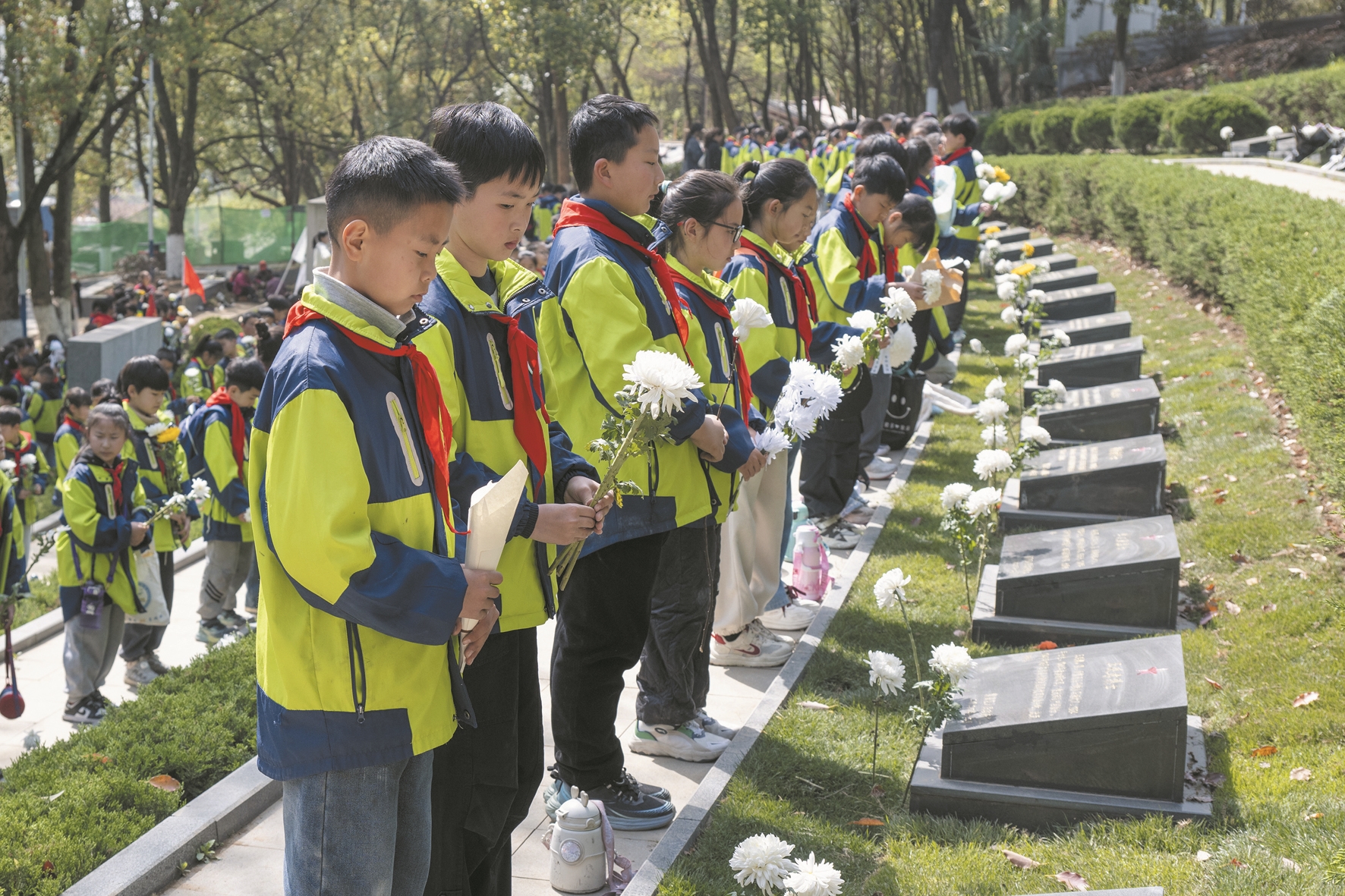 图为4月1日,学生在安徽省芜湖市繁昌区烈士陵园祭扫革命先烈。 (新华社发)