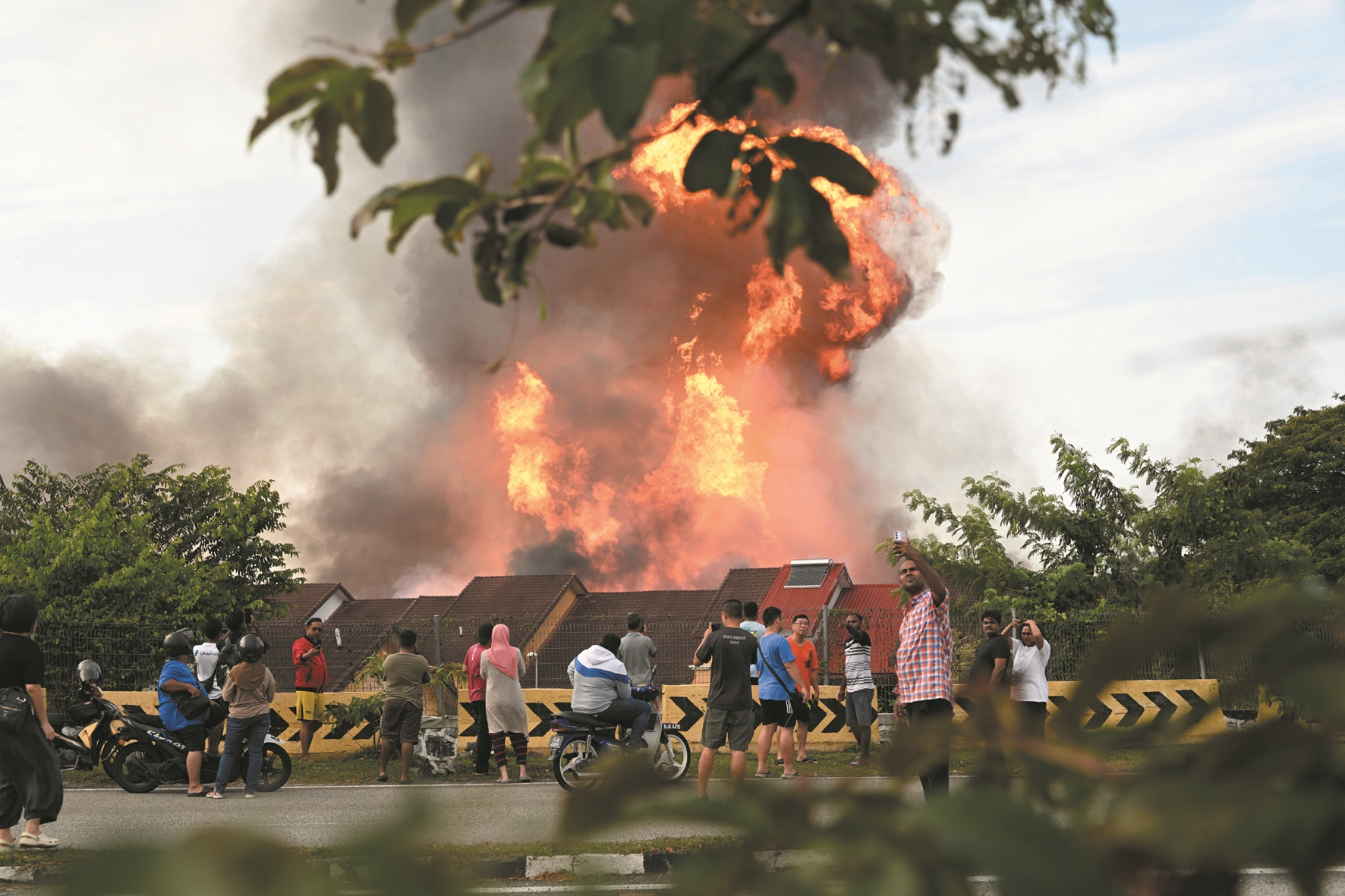 图为4月1日,在马来西亚雪兰莪州蒲种市,人们围观燃气管道爆炸事故引发的大火。