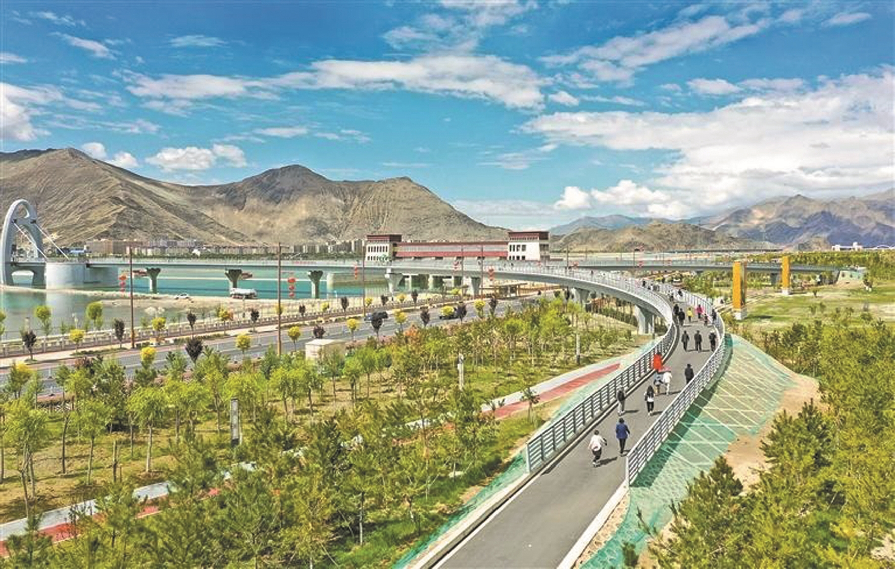 位于拉萨河畔的中华文化公园里,阳光灿烂、微风轻拂,蜿蜒交错的步道上,随处可见市民休闲娱乐的身影。