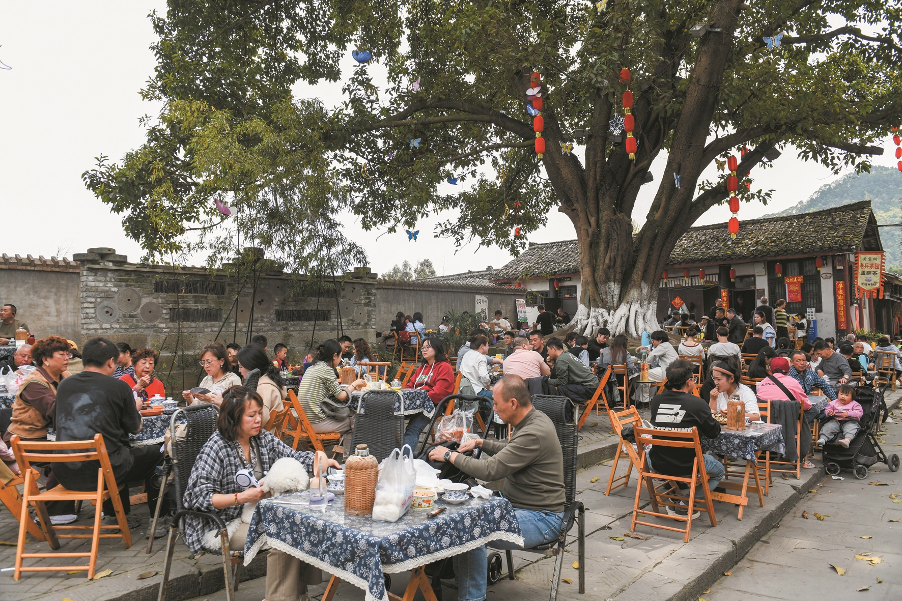 图为4月5日,游客在四川省阆中古城品茶休闲。