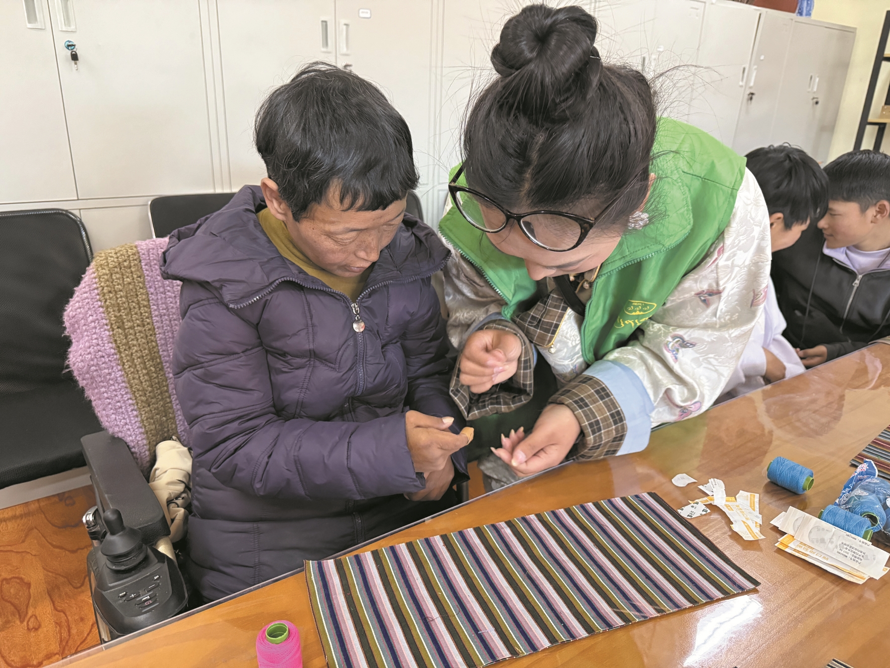 今年40岁的托养对象次仁罗吉,曾因残疾而自我封闭,如今他能在手工台上熟练操作,对学习手艺满怀热忱,对未来充满信心。“自从身体残疾,我很是自卑,连出门的勇气都没有。2016年,我来到托养服务中心,这里科学安排锻炼,合理规划饮食,我的身体状况明显好转,心情也格外舒畅了。在这里,我学会织毛毯、做花束,生活渐渐有了盼头。今天,西藏叁柒实业有限公司专门派人来教我们缝纫邦典,我相信只要不懈努力,就能增加收入。”次仁罗吉说。