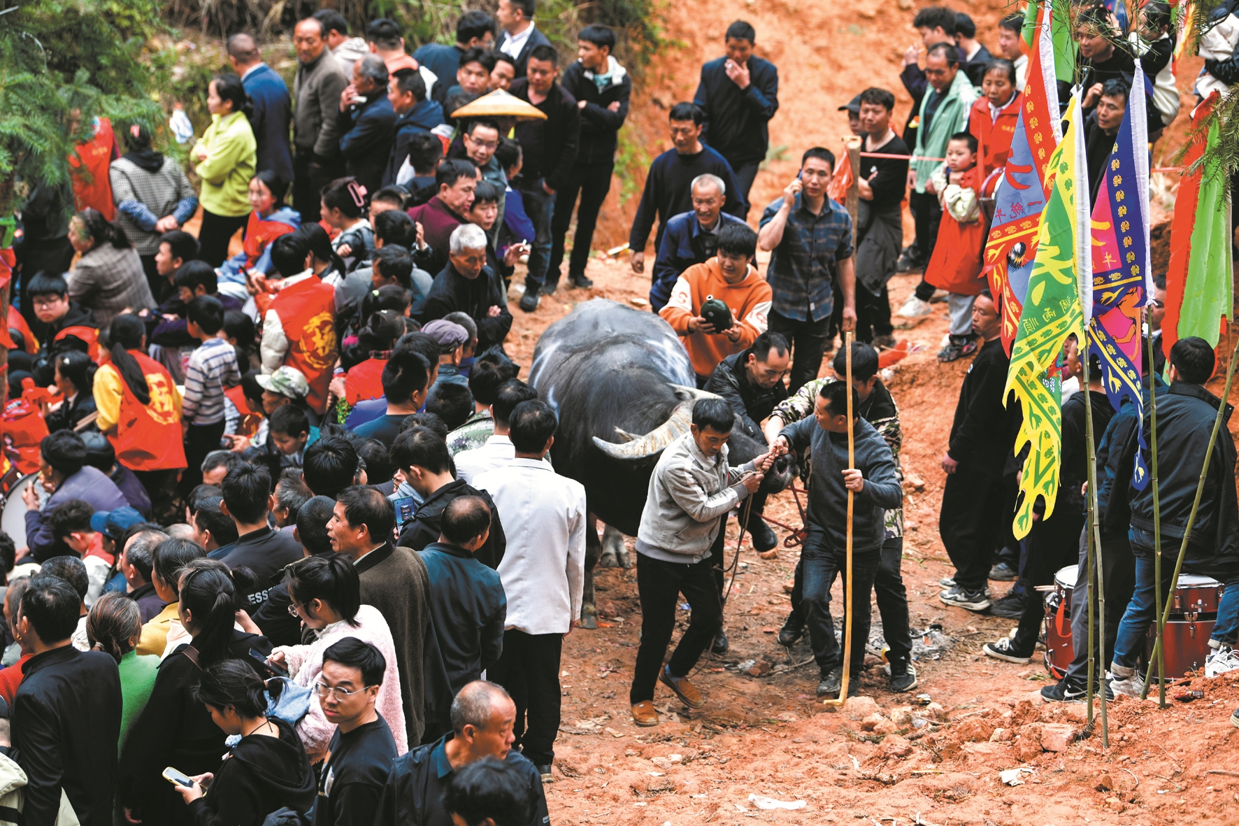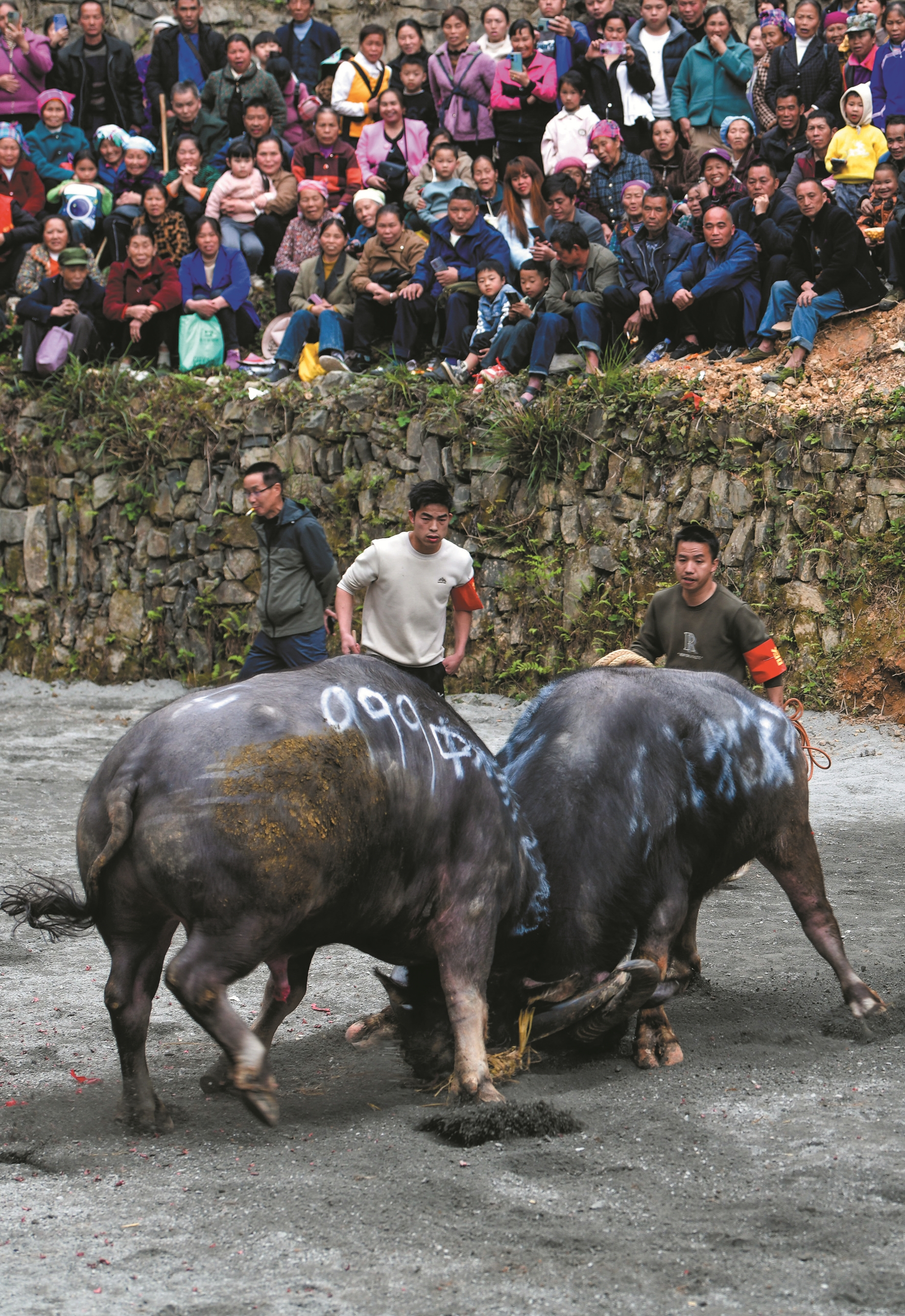 图?为人们在贵州省锦屏县固本乡东庄村观看民间斗牛。