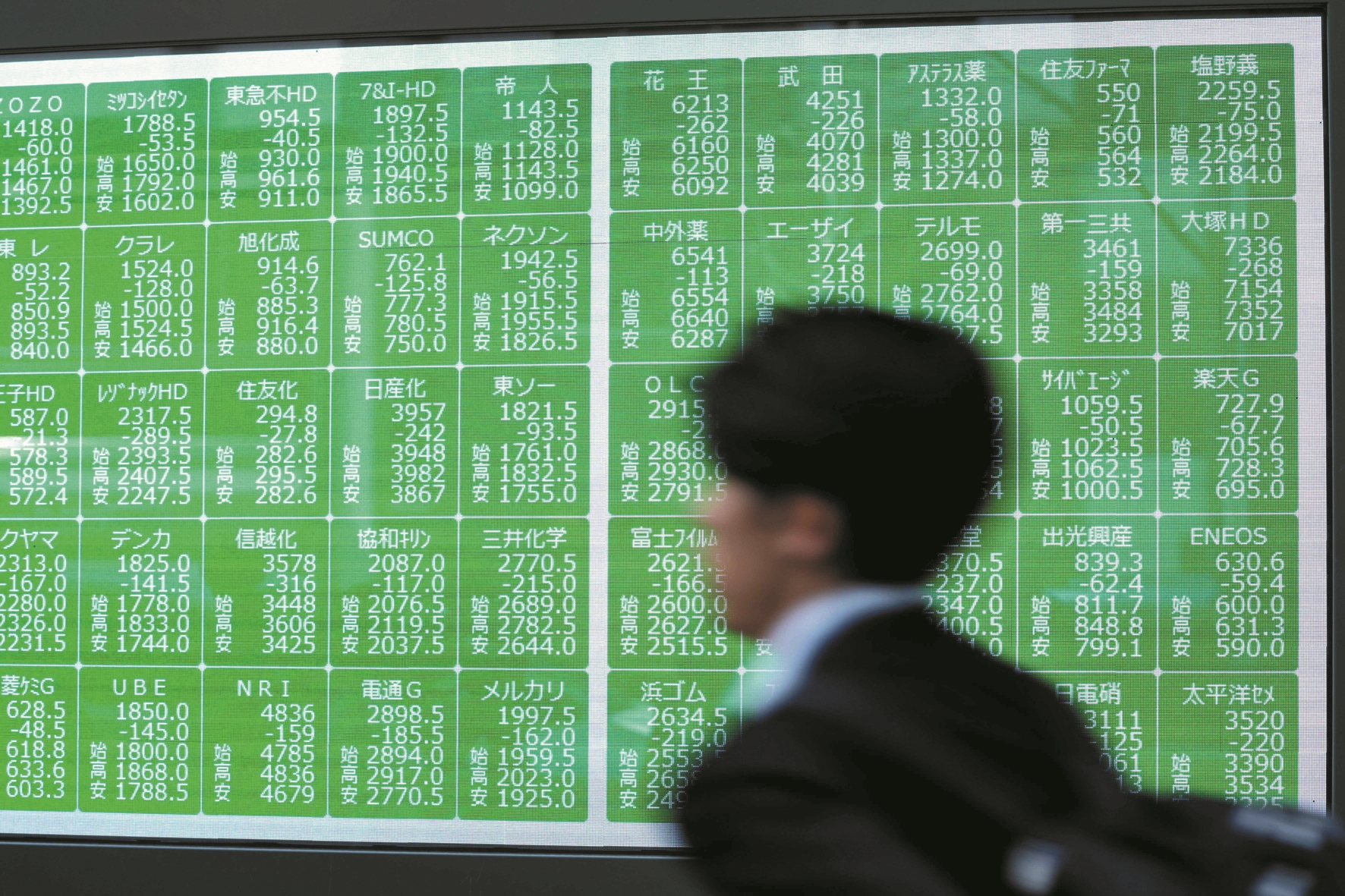 图为4月7日,行人经过日本东京的一处电子股指显示屏。(新华社发)