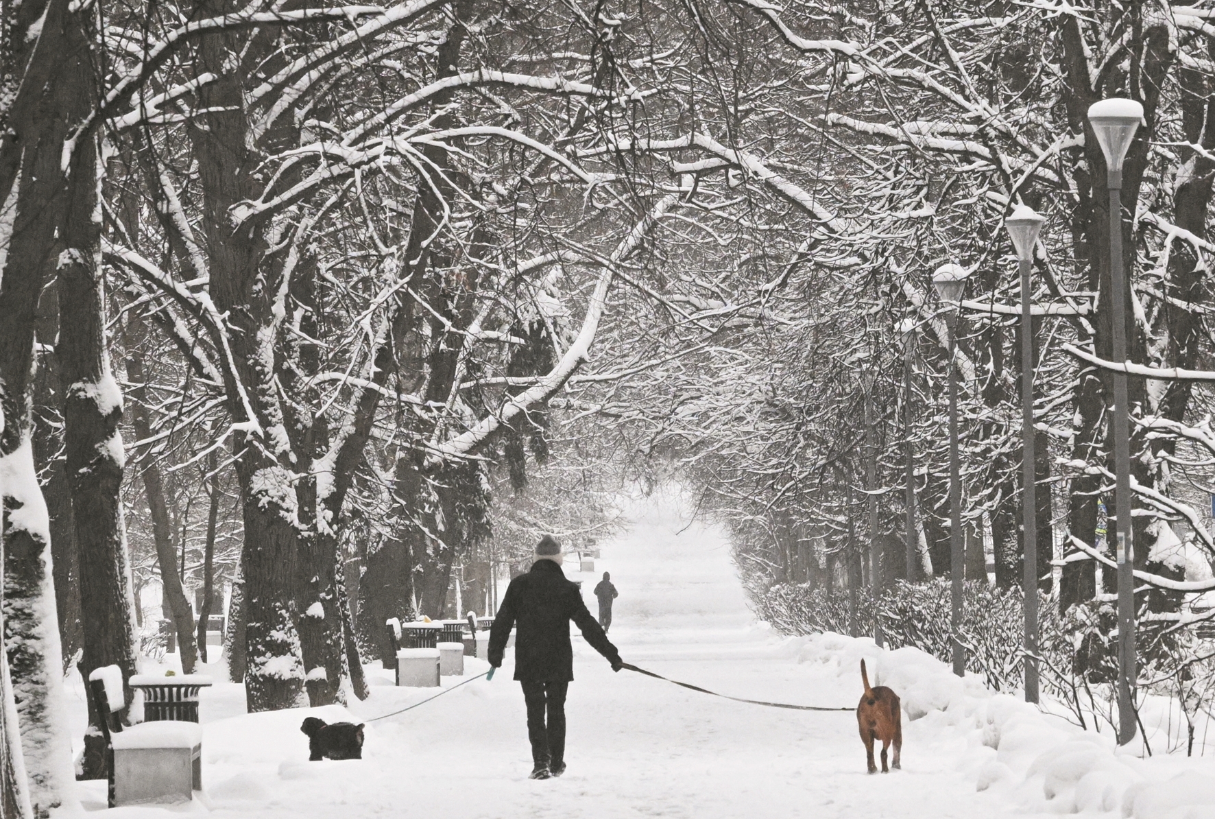 这是4月9日,一名男子冒雪在俄罗斯莫斯科一个公园遛狗。