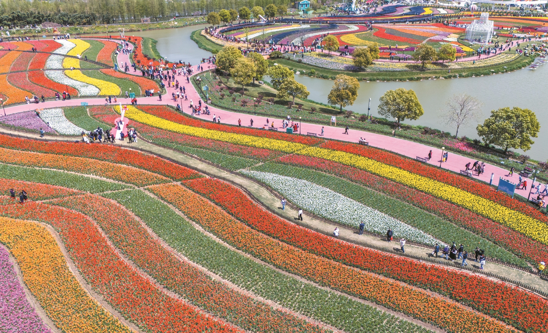 ?图为4月13日,游客在江苏省盐城市大丰区荷兰花海景区内赏花游玩(无人机照片)。(新华社发)