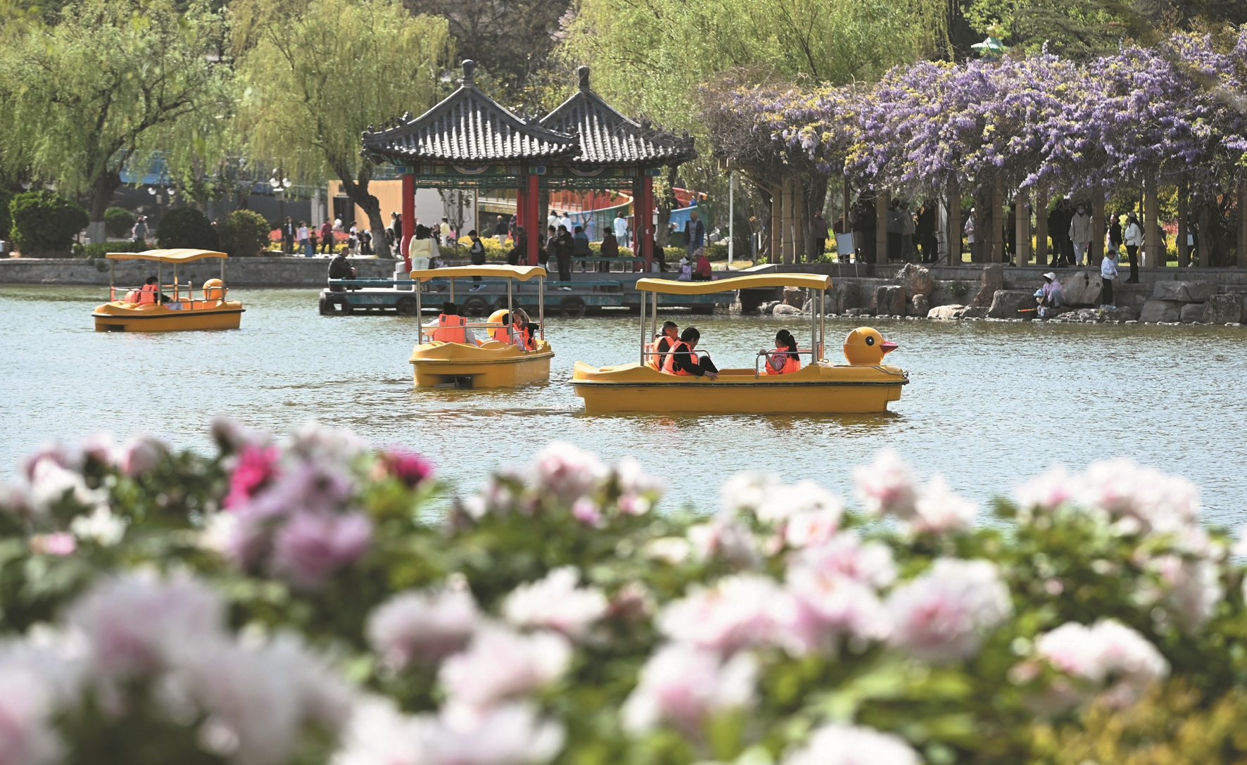 春日寻芳画里行 春日花开艳丽,人们纷纷寻芳踏翠。 ?图为4月13日,游客在山东省滕州市荆河公园内乘船赏花。 (新华社发)