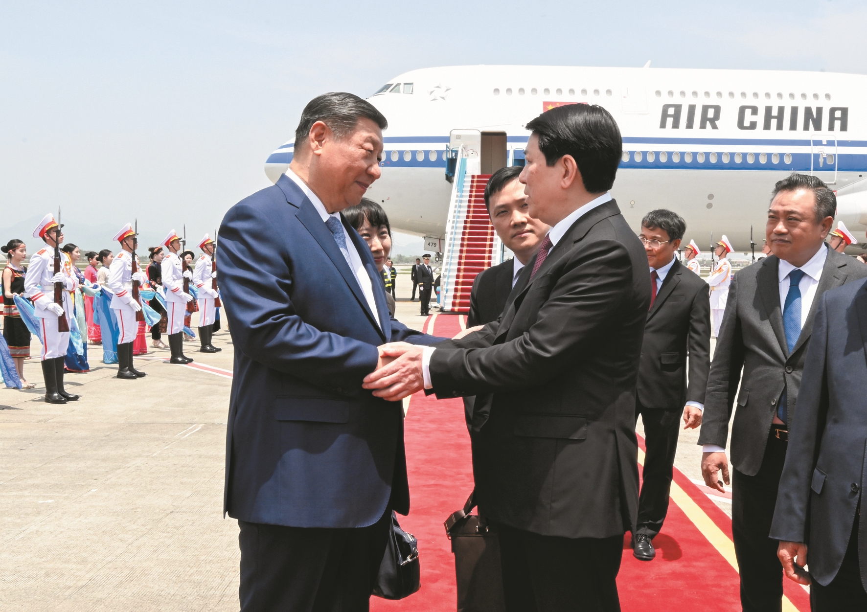 当地时间4月14日中午,中共中央总书记、国家主席习近平乘专机抵达河内,应越南共产党中央委员会总书记苏林、越南社会主义共和国主席梁强邀请,对越南进行国事访问。习近平乘专机抵达河内内排国际机场时,越南国家主席梁强,越共中央政治局委员、中央书记处常务书记陈锦绣,越共中央书记处书记、中央办公厅主任黎怀忠等越南党政领导人和地方代表热情迎接。新华社记者 李学仁摄