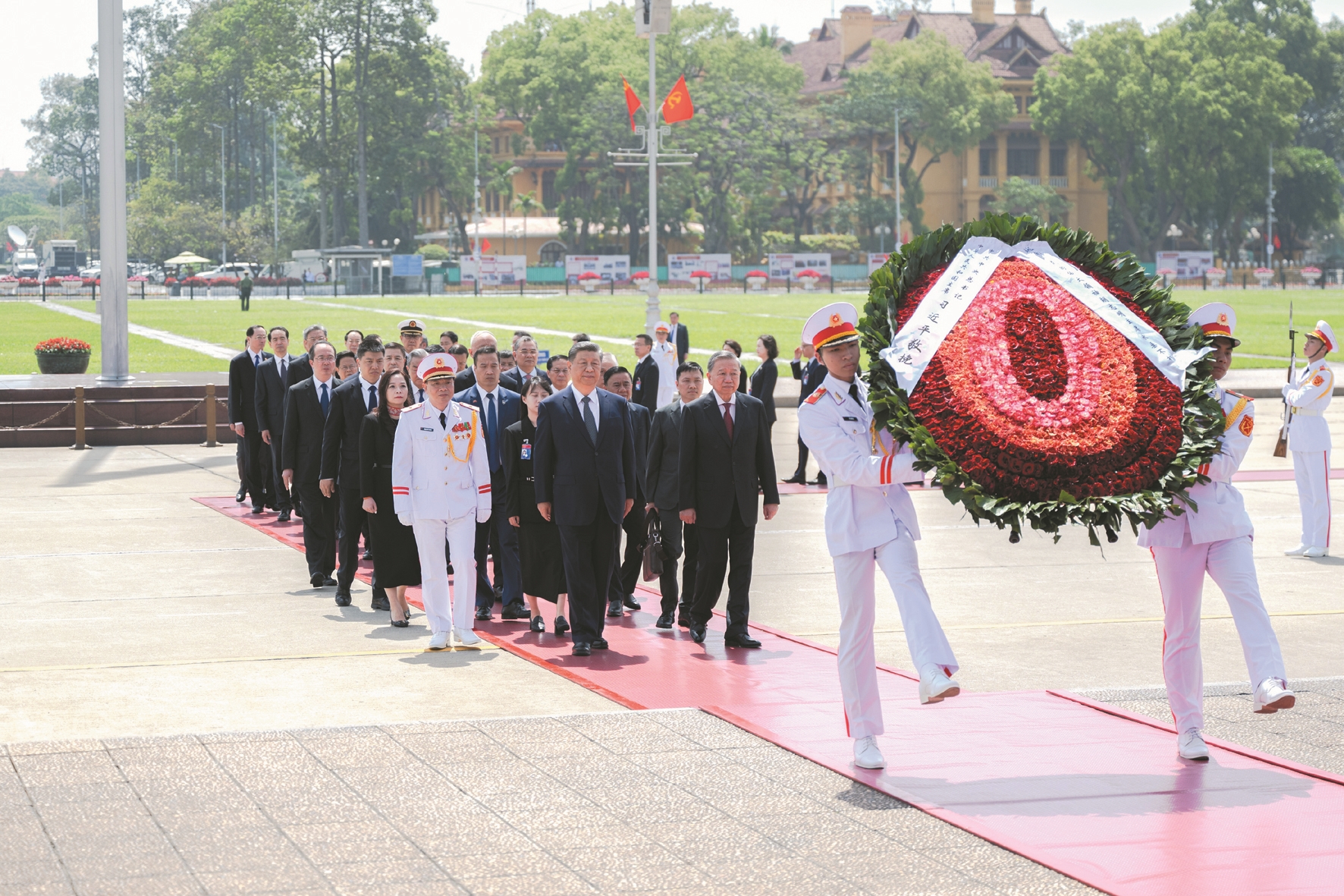 四月十五日上午,在越共中央总书记苏林陪同下,中共中央总书记、国家主席习近平瞻仰胡志明陵并敬献花圈。 新华社记者 燕 雁摄