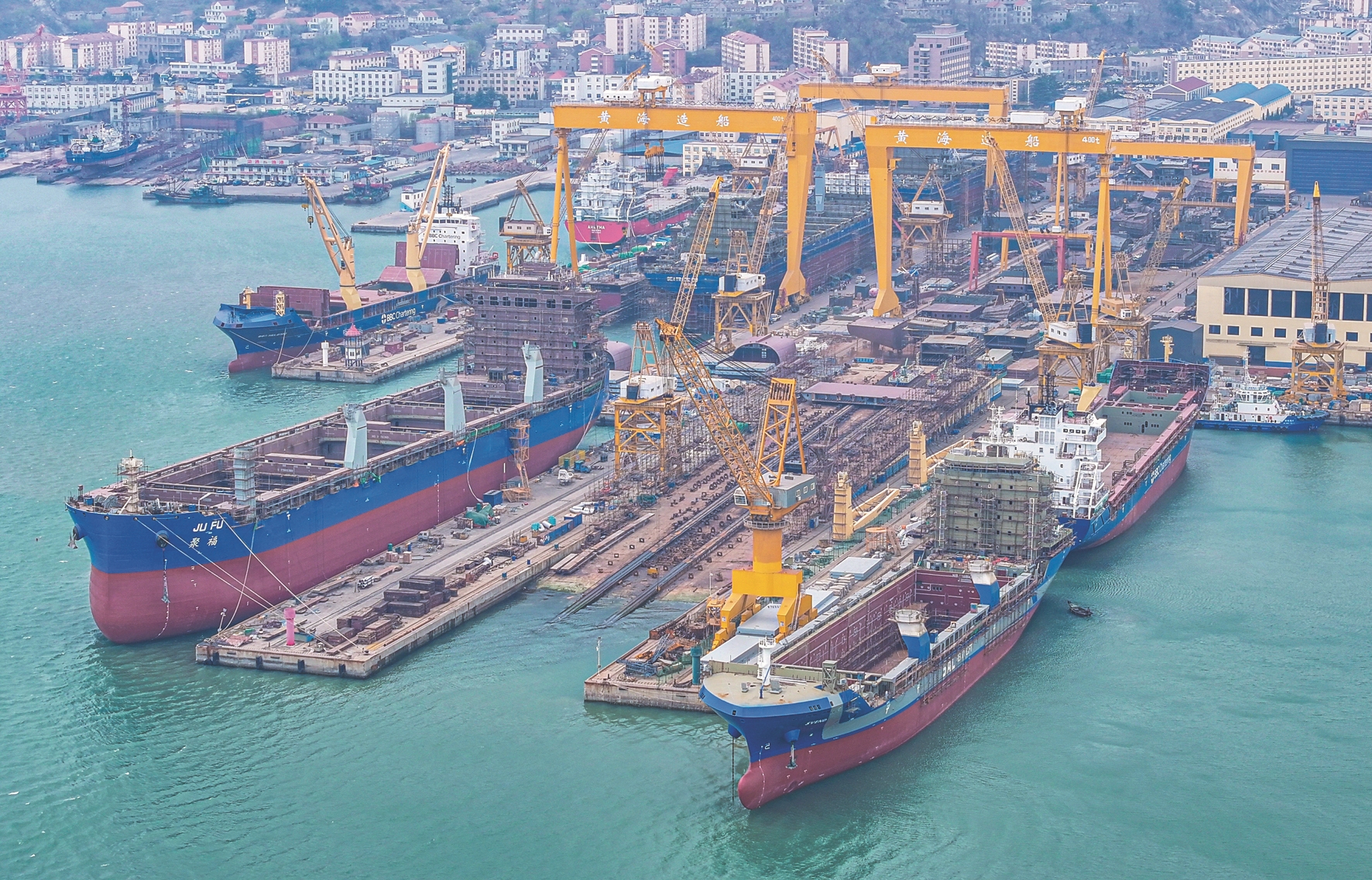 这是4月16日在山东省荣成市石岛管理区修造船产业基地拍摄的加紧建造和维修的各类大型船舶(无人机照片)。(新华社发)
