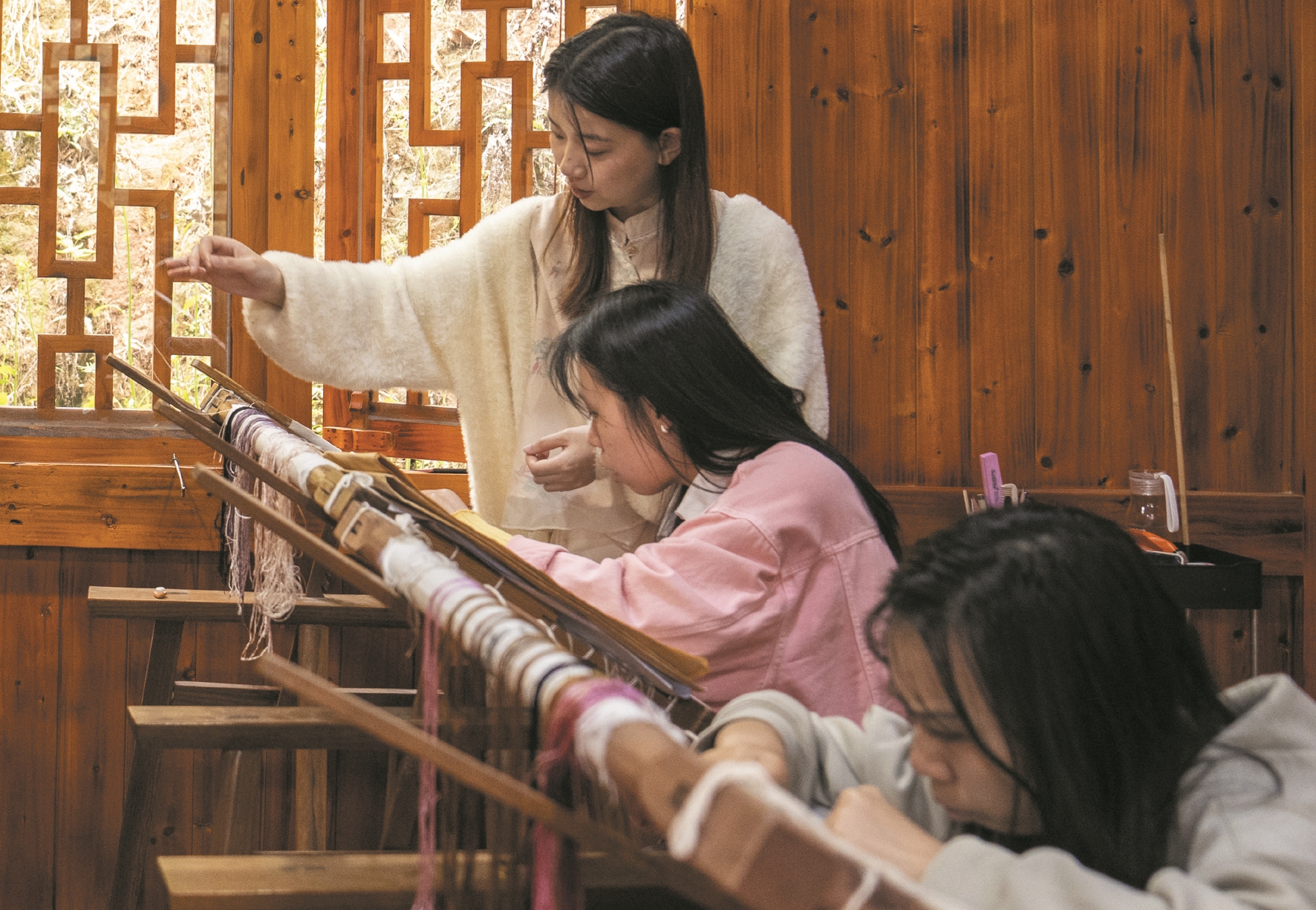 图为4月17日,在桃源县郑家驿镇梨子岗村齐绘绣庄,肖瑶(后)与绣庄同事讨论刺绣产品。 (新华社发)