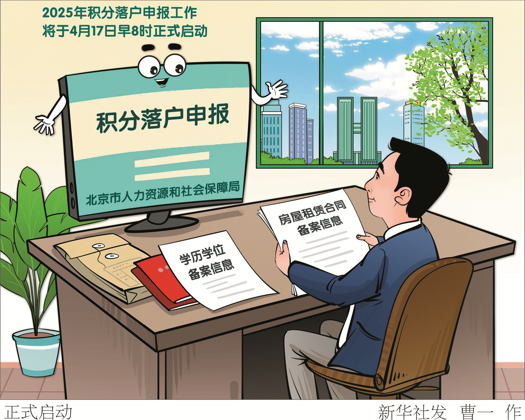 北京市人力资源和社会保障局4月16日发布消息,2025年积分落户申报工作将于4月17日早8时正式启动,申报期限为30个自然日,7月14日公示年度落户人员信息,2025年积分落户规模为6000人,并实行同分同落。 (新华社发)