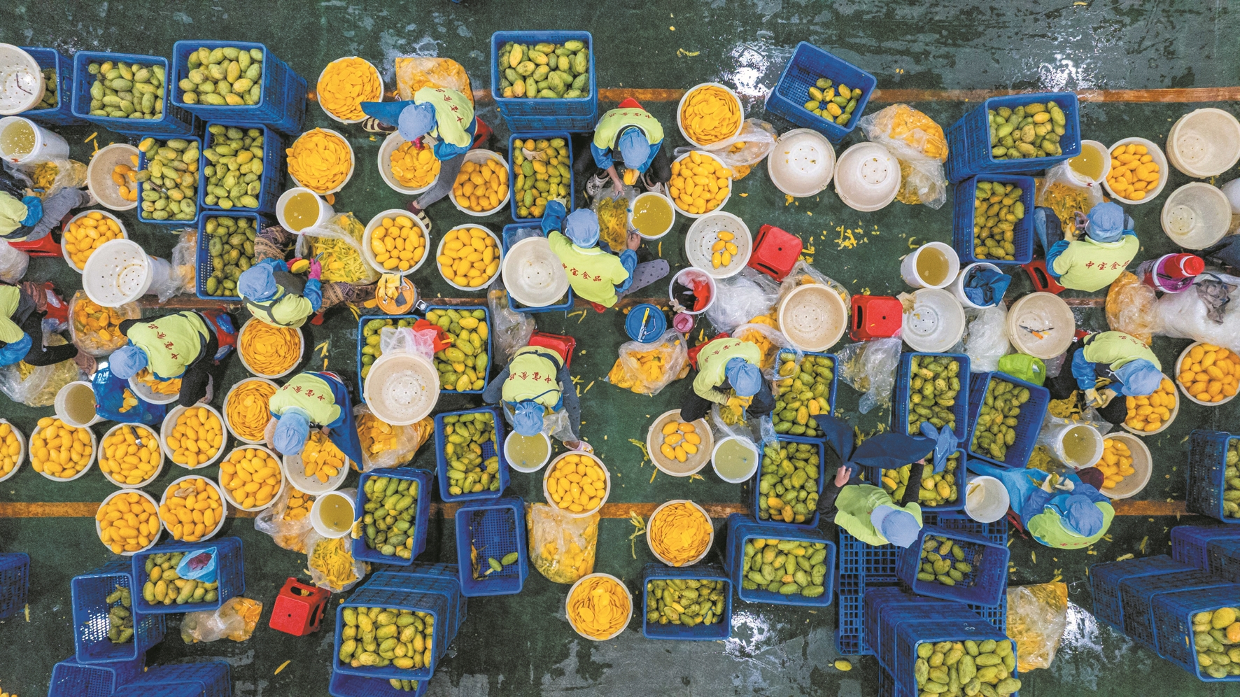 ↑3月18日,在柬埔寨磅士卑省尖山县,工人在芒果干生产厂房内削芒果(无人机照片)。(新华社发)