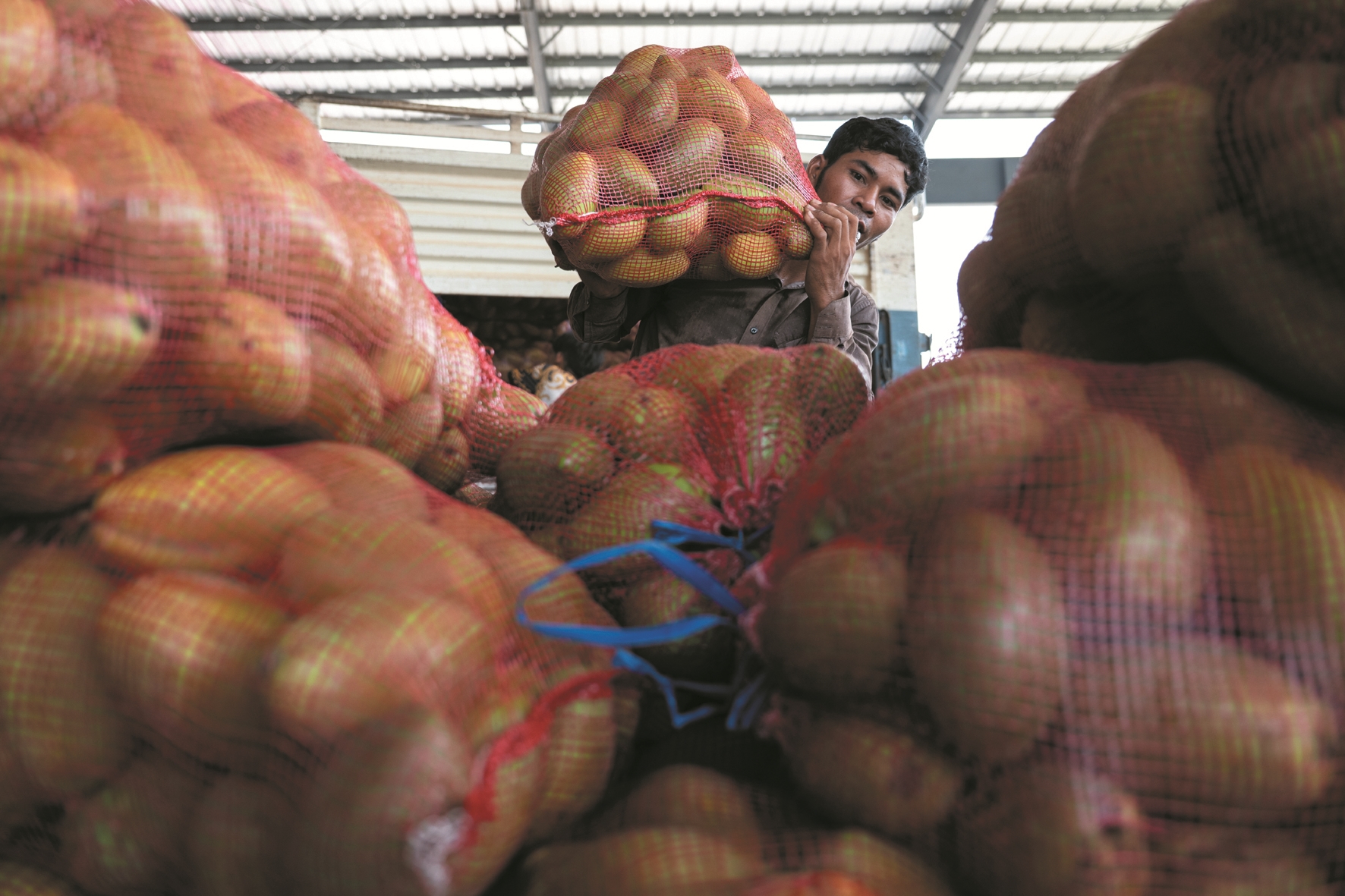 ↑3月18日,在柬埔寨磅士卑省尖山县,工人在芒果干生产厂房搬运芒果。(新华社发)