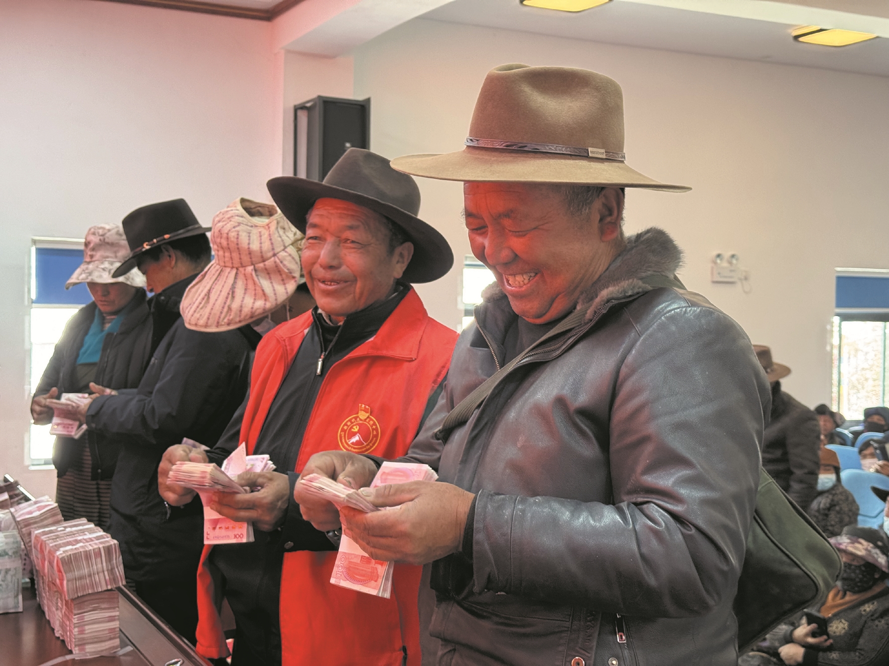 达嘎镇其奴村4组村民卓嘎高兴地说:“2023年的分红在2024年发放时,每人分得约213元。今年在党的好政策和村‘两委’的大力支持下,每人能拿到约380元分红。我家七口人,这次分红加上组里土地租赁收益,累计有4000余元。”