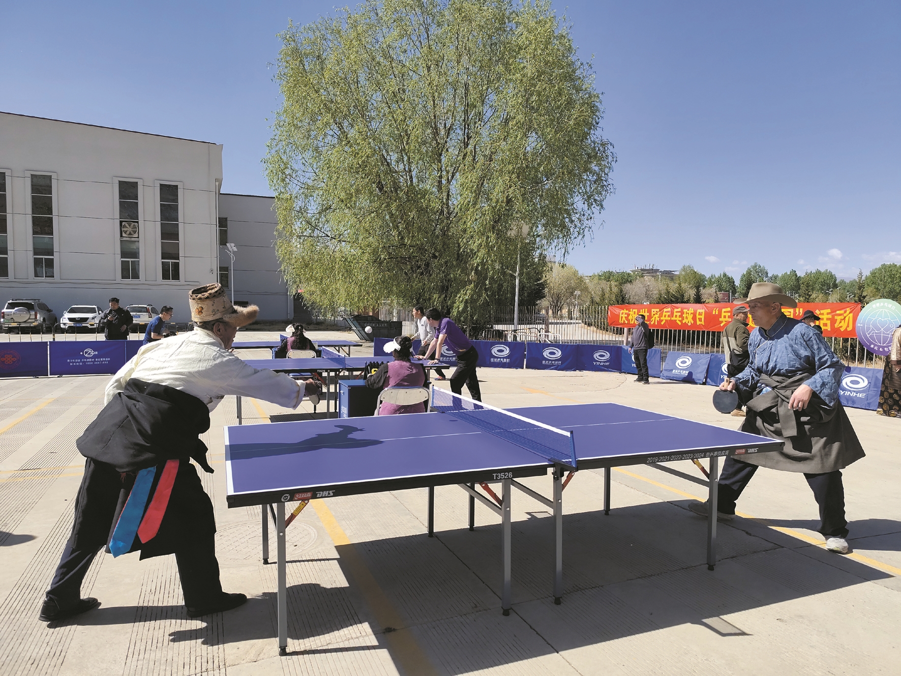 晨光中,三张崭新的乒乓球台依次排开,深蓝色台面在高原阳光下熠熠生辉。身着传统藏装的阿姨与穿着运动服的外孙同台竞技,少年与母亲隔网相对,不同年龄、不同民族的乒乓球爱好者在此刻共享运动的快乐。