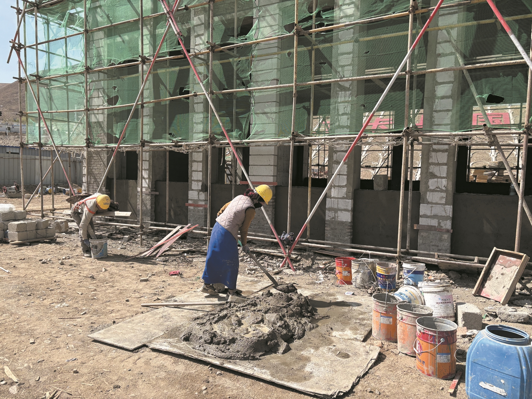 图为施工现场,工人们在搅拌水泥。拉萨融媒记者 莫瑞英摄