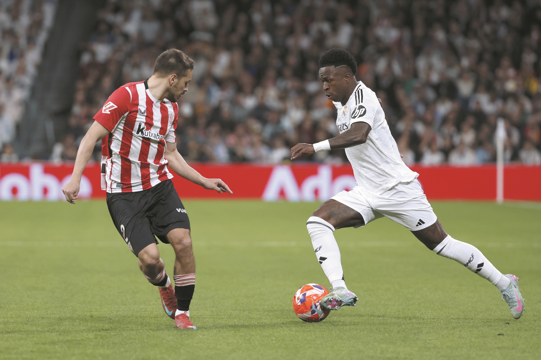图为皇家马德里队球员维尼修斯(右)与毕尔巴鄂竞技队球员戈罗萨韦尔拼抢。(新华社发)