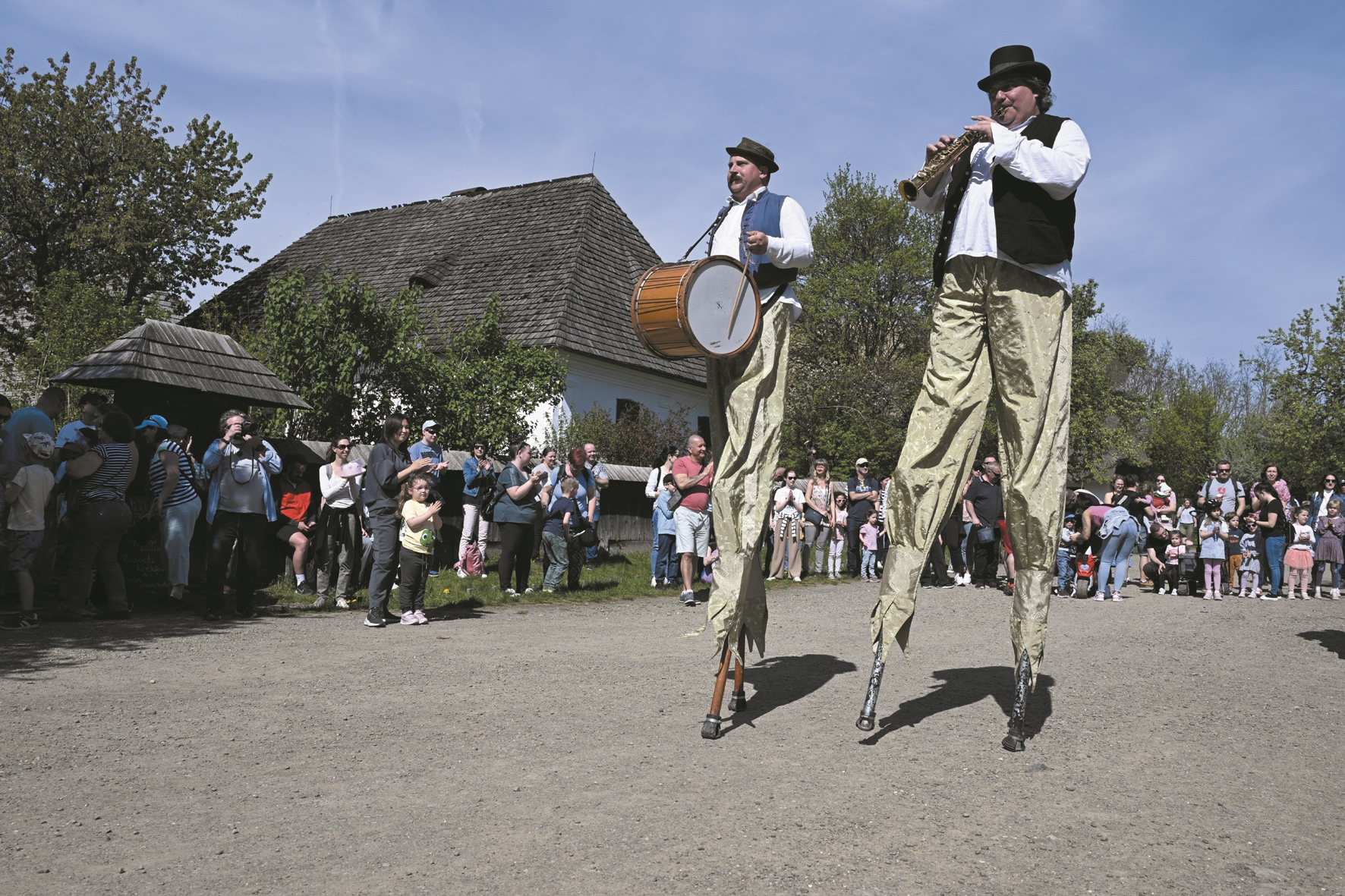 图为4月21日,在匈牙利圣安德烈的露天民族学博物馆,身着传统服饰的乐手表演踩高跷,庆祝复活节星期一。