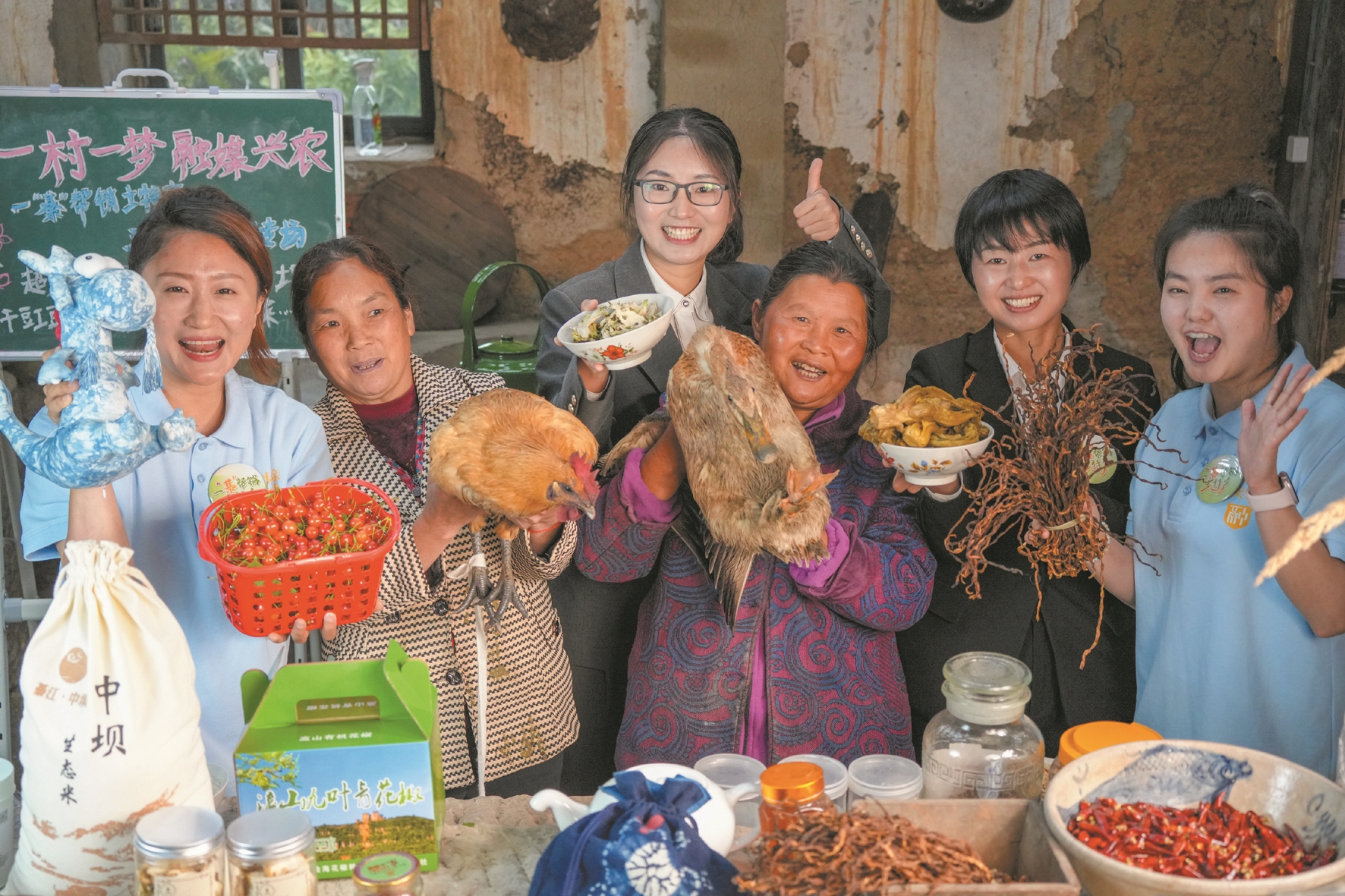 图为4月24日,在重庆市綦江区三角镇中坝村,“村书记”主播团在直播间和村民一起推介乡村土特产。