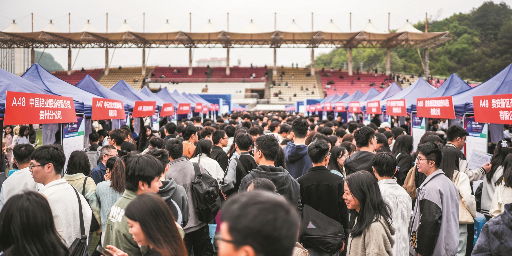 4月26日,第十三届贵州人才博览会在贵阳市开幕,博览会主办方线上线下收集发布人才需求6.3万余个,吸引了众多求职者前来应聘。