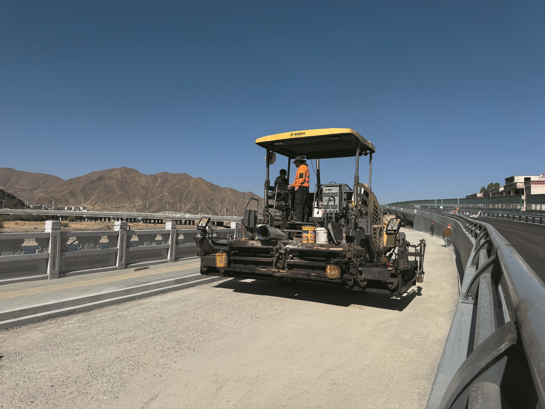 图为工人正在进行沥青下面层铺设作业。 拉萨融媒记者 拉姆次仁摄