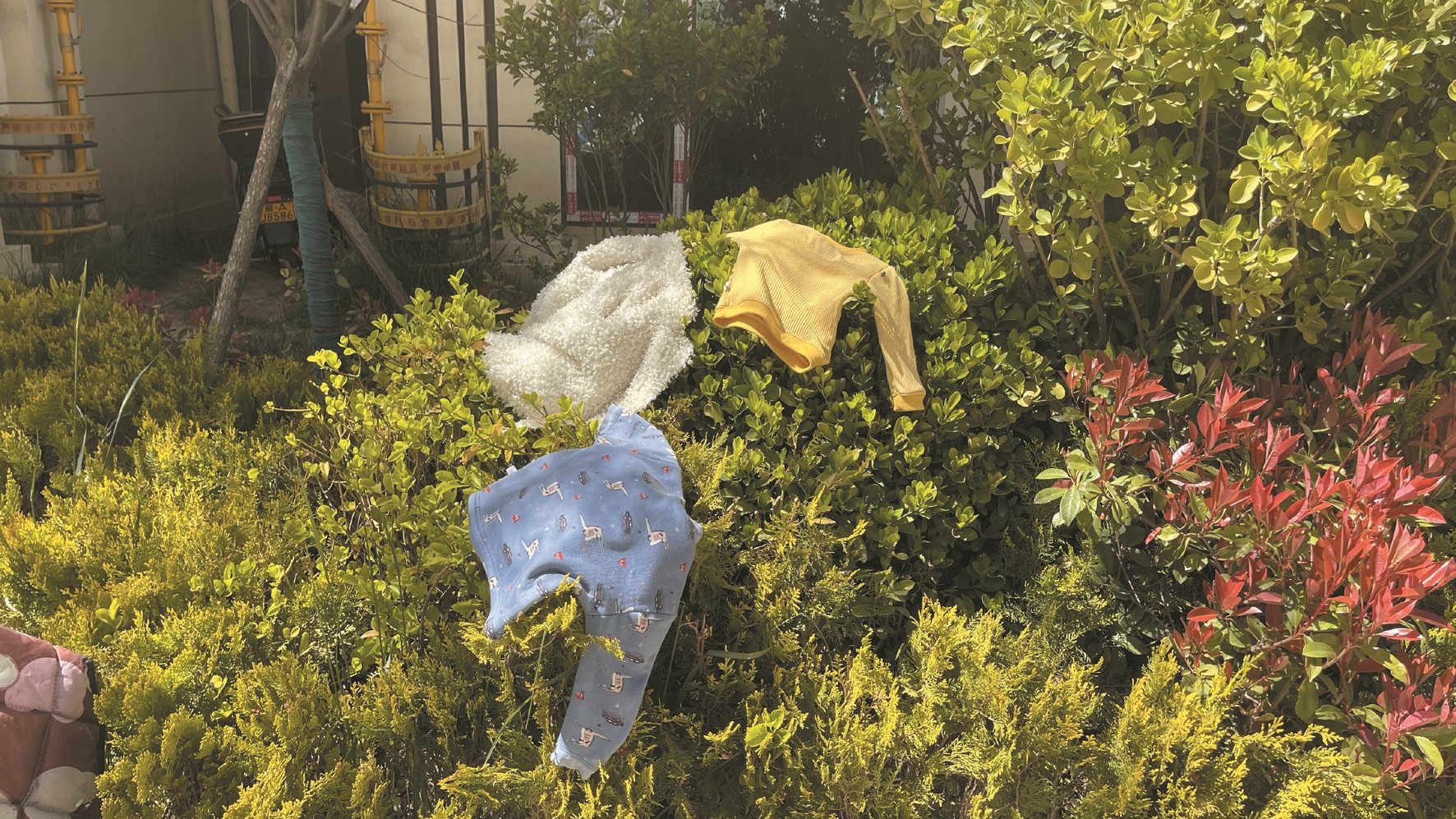 图为南山郡小区绿化带上晾晒衣物。 拉萨融媒记者 次央卓摄