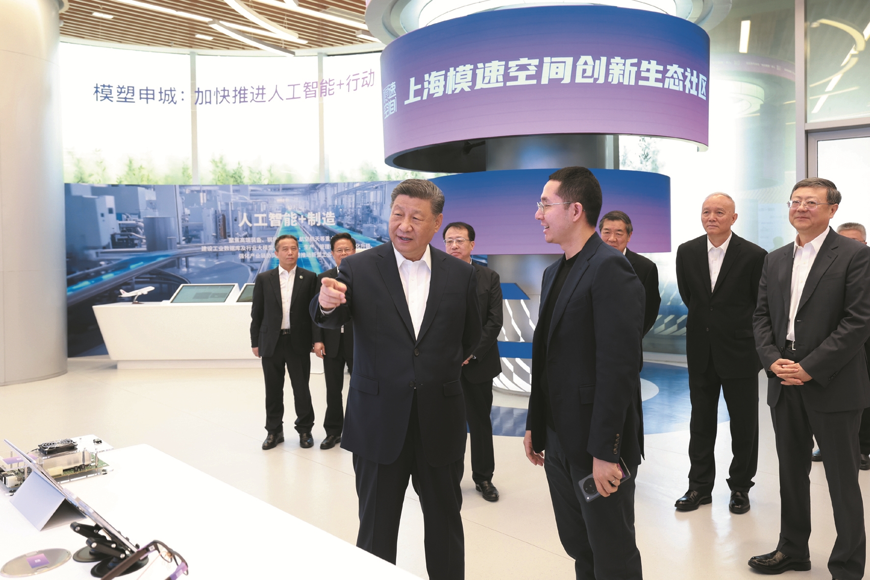 “模速空间”是上海市打造的人工智能大模型专业孵化和加速平台,已入驻企业100余家。习近平来到这里,通过视频短片了解上海市人工智能产业发展情况,察看重点孵化企业的大模型产品展示,听取相关技术研发和企业生产经营介绍。习近平对上海积极发展人工智能取得的实效给予肯定。他指出,人工智能技术加速迭代,正迎来爆发式发展,上海要总结好以大模型产业生态体系孵化人工智能产业等成功经验,加大探索力度,力争在人工智能发展和治理各方面走在前列,产生示范效应。