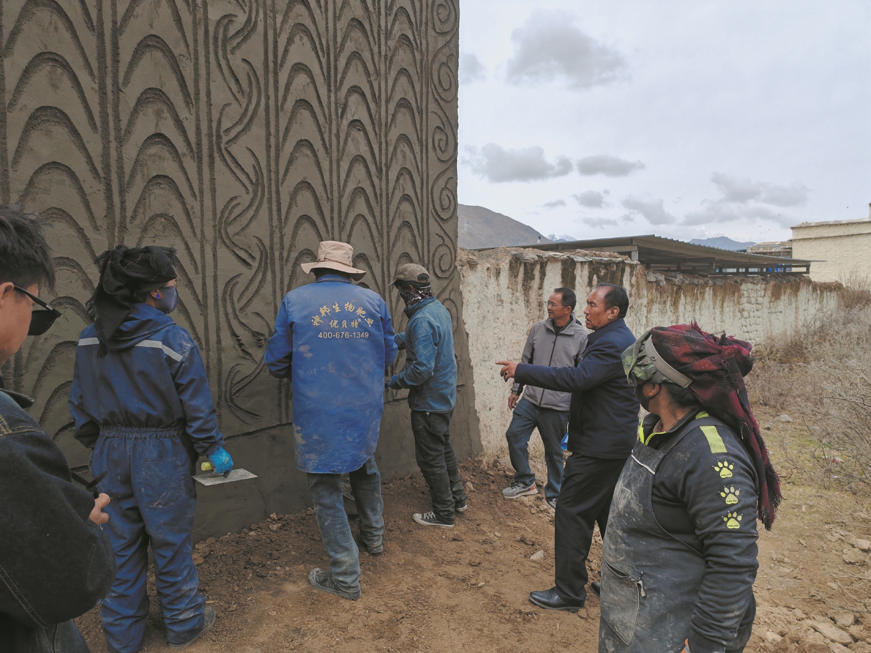 图为刚琼(右二)在工地一线手把手指导合作社员工施工技术。 拉萨融媒记者 次 珍摄