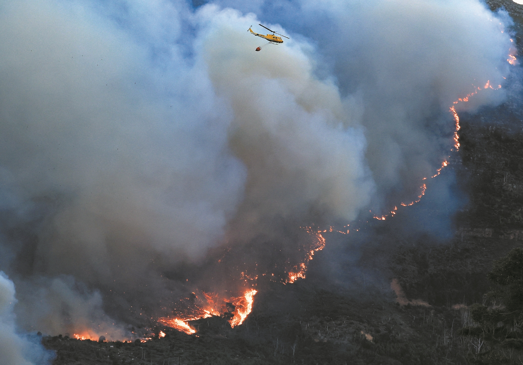 图为4月27日,直升机在南非开普敦的桌山国家公园参与灭火作业。 (新华社发)