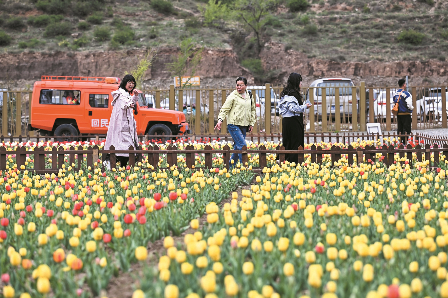 图为5月4日,游客在位于回民区东乌素图村的乌素图杏花谷景区游玩。